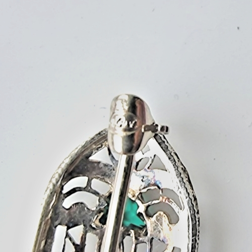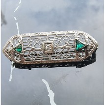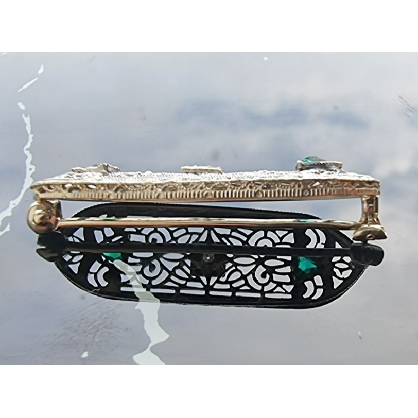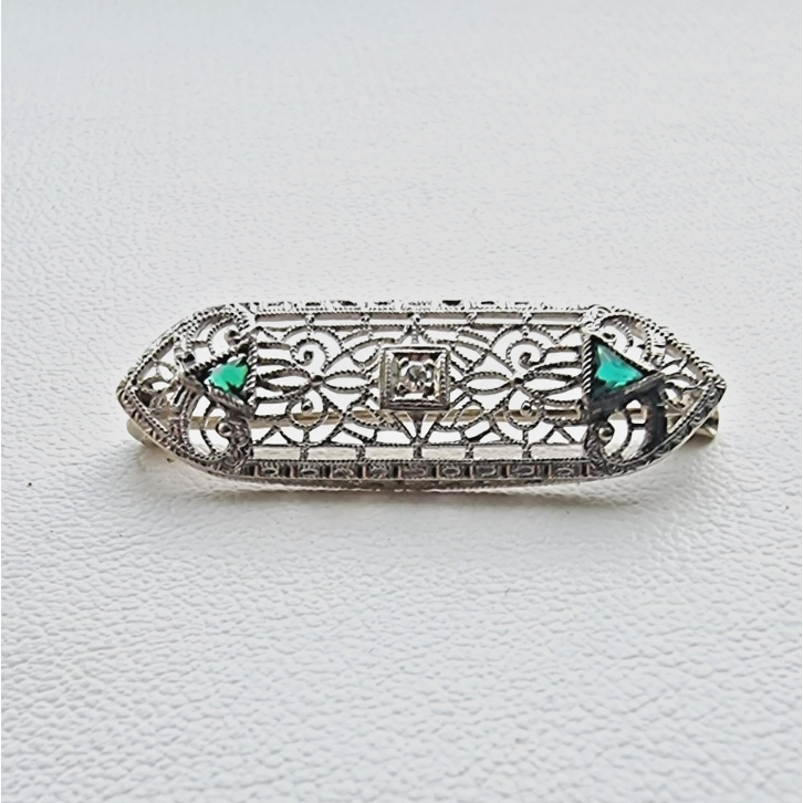14K WHITE GOLD DIAMOND AND TRILLION EMERALD FILIGREE ART DECO BROOCH 2.1 gram AT