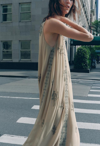 Long pearl greydress made from viscose yarn. V-neck and sleeveless design. Embroidered detail with beaded appliques. Inner lining.