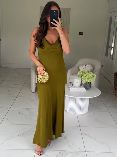 Flowing olive green long V-neck dress with wide straps. Asymmetric A-line hem. Adjustable open back with ties.