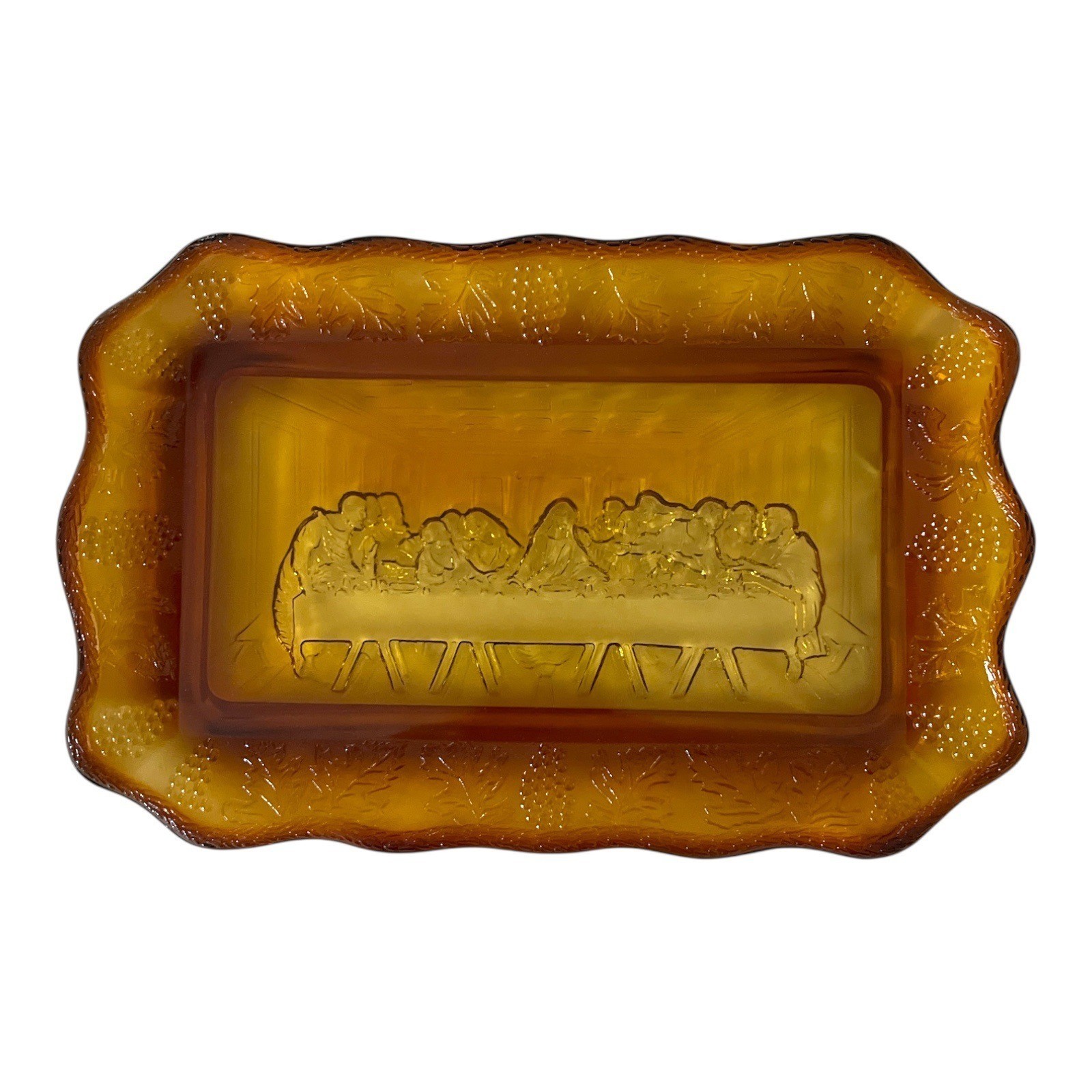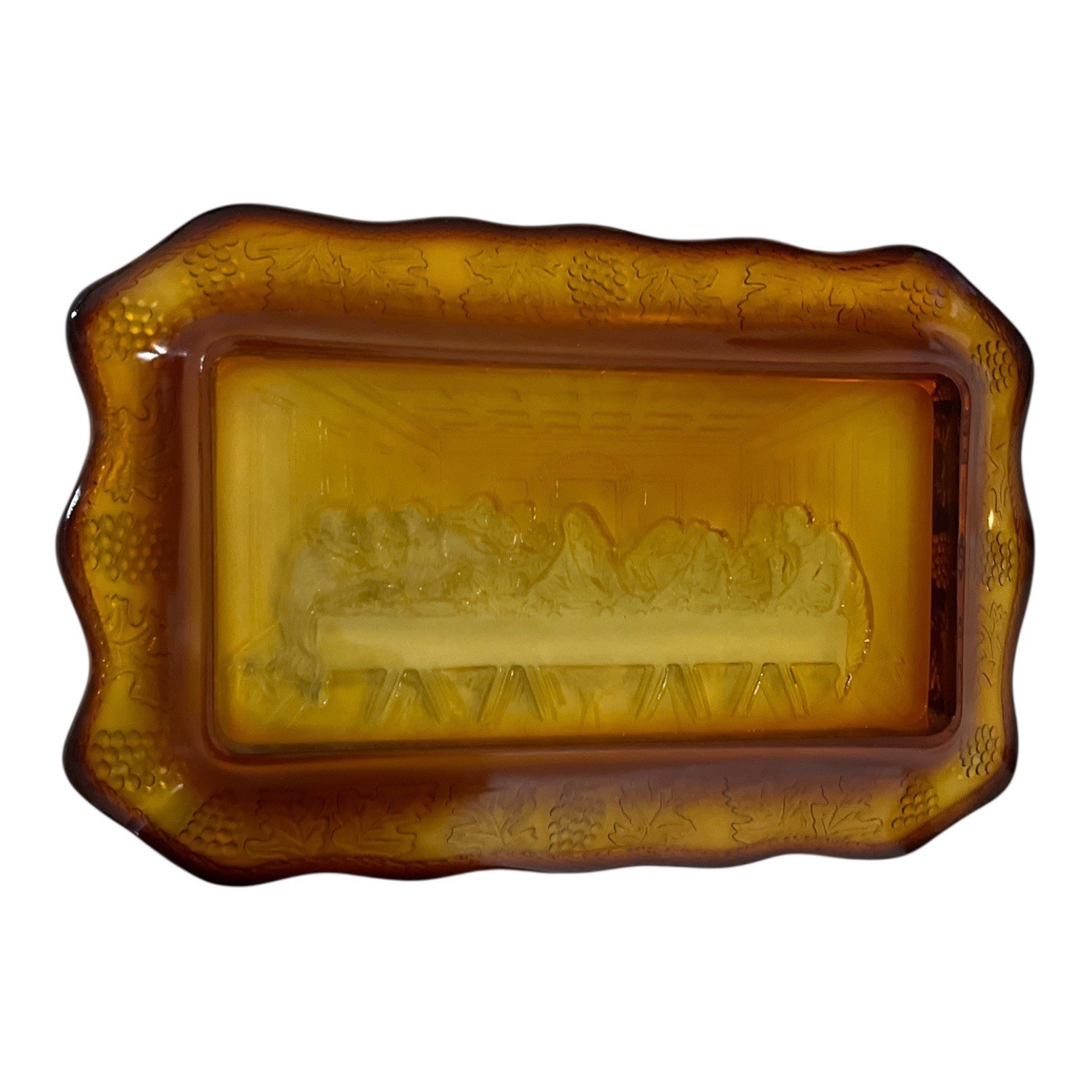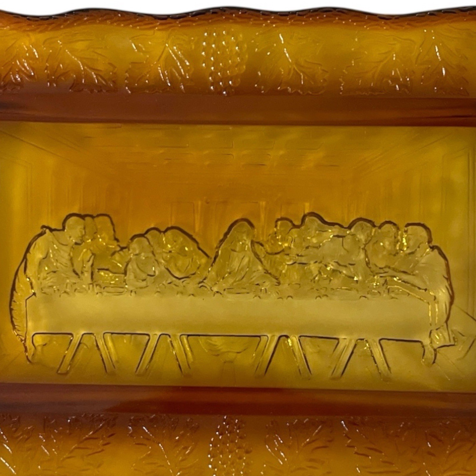 This vintage amber glass tray features a molded depiction of the Last Supper in the center, surrounded by a scalloped border with embossed grapevine and leaf motifs. Likely produced during the 1960s?1970s, this decorative pressed glass piece was commonly displayed as wall art or used as a religious collectible or serving tray.