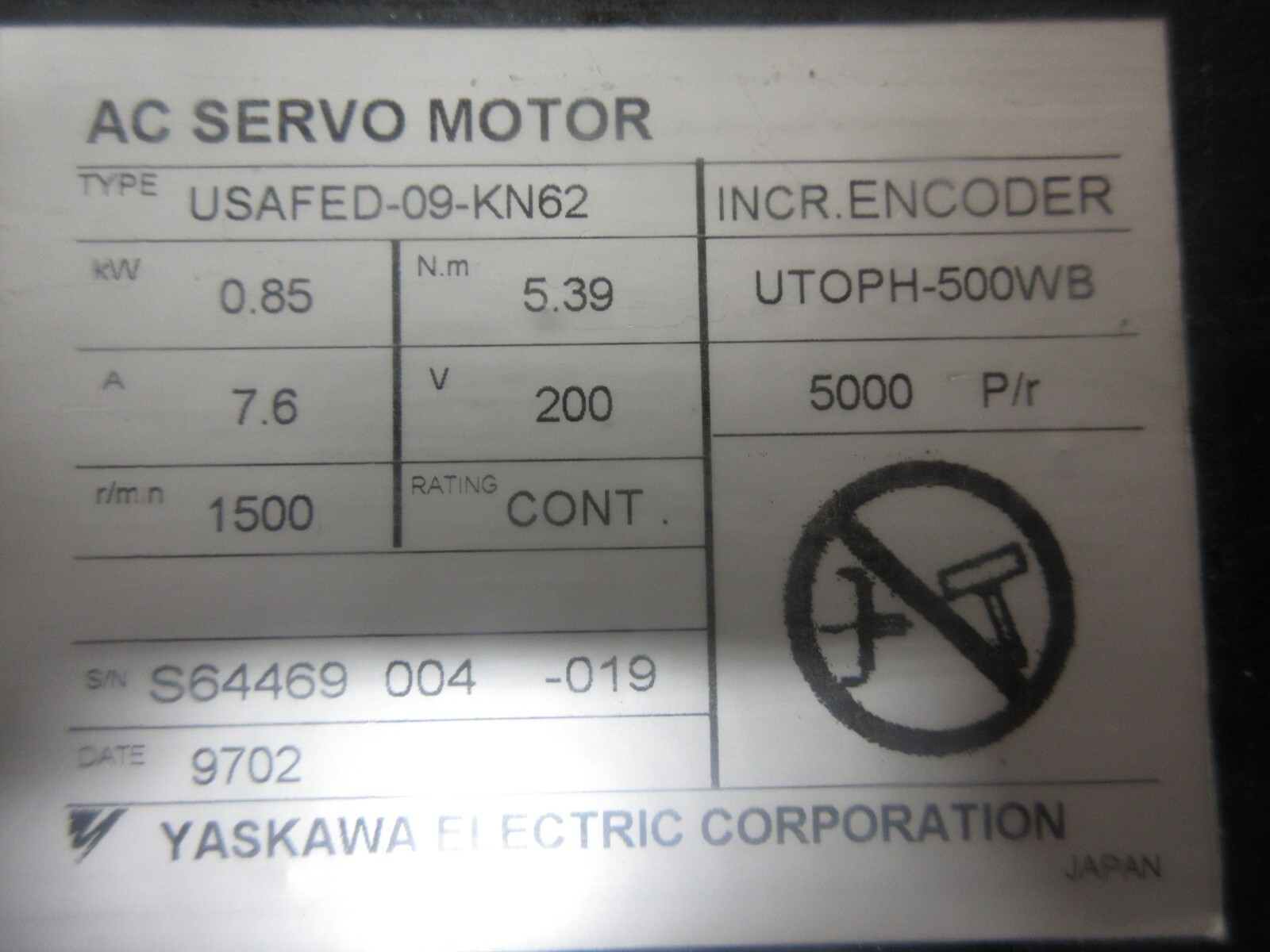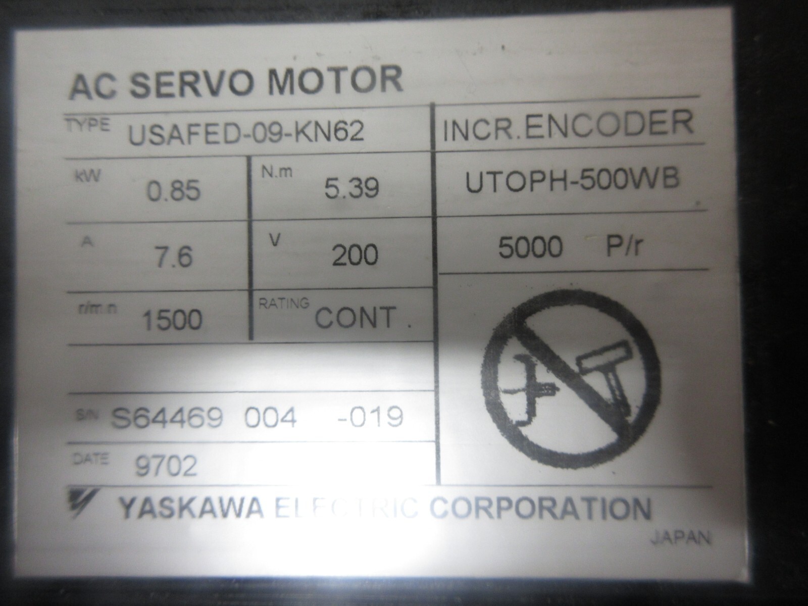 *SPECIAL PRICE* YASKAWA AC SERVO MOTOR USAFED-09-KN62 UTOPH-500WB 5000 P/R