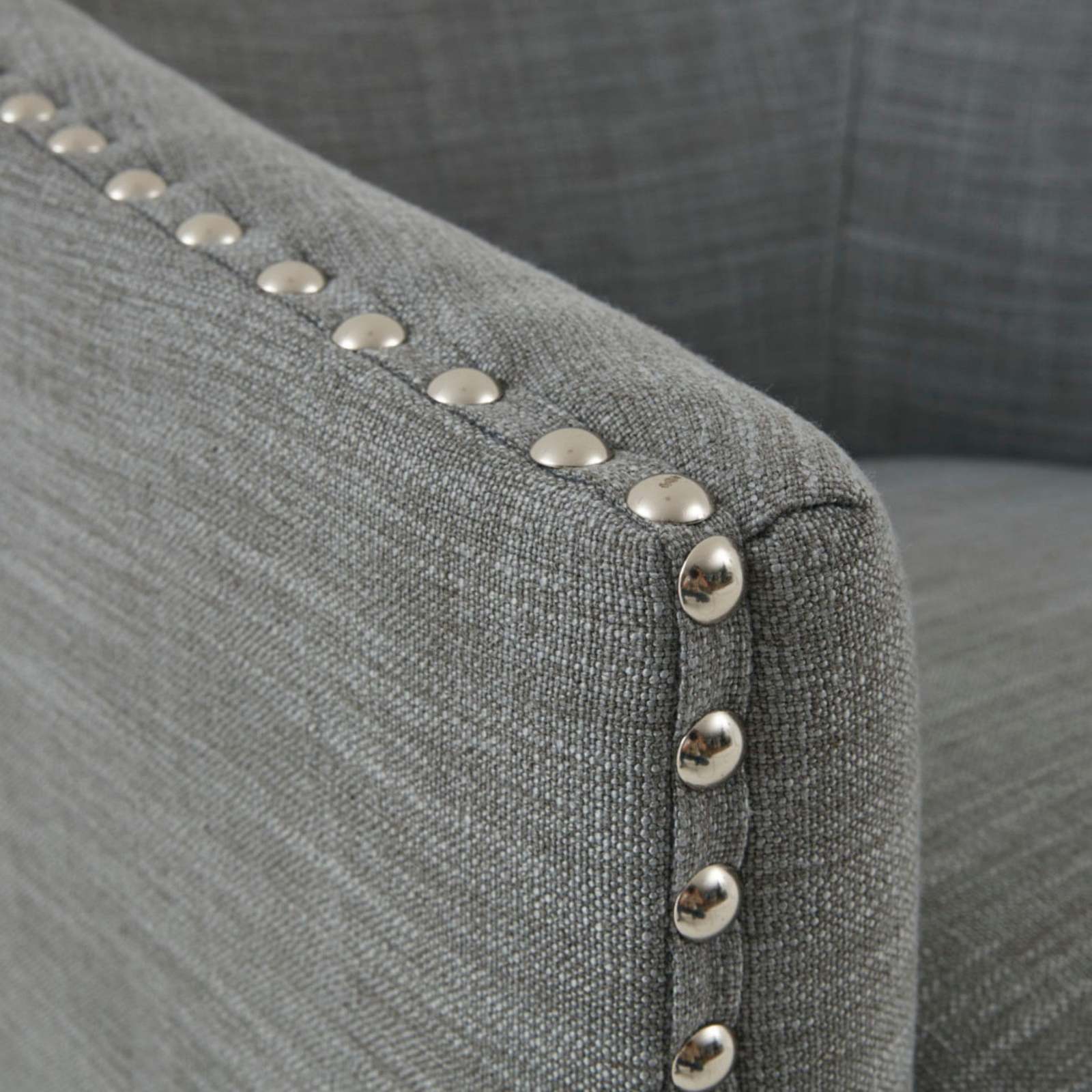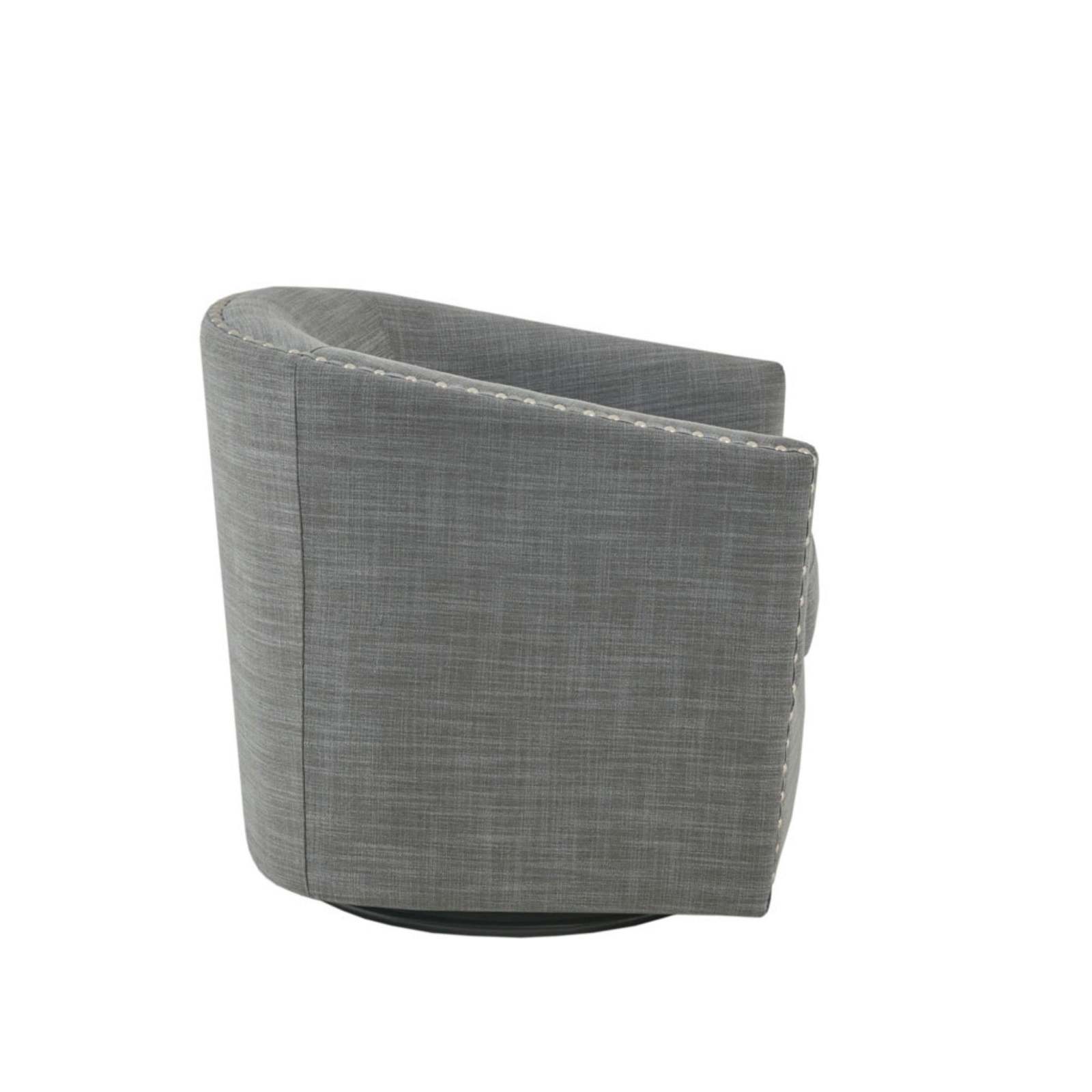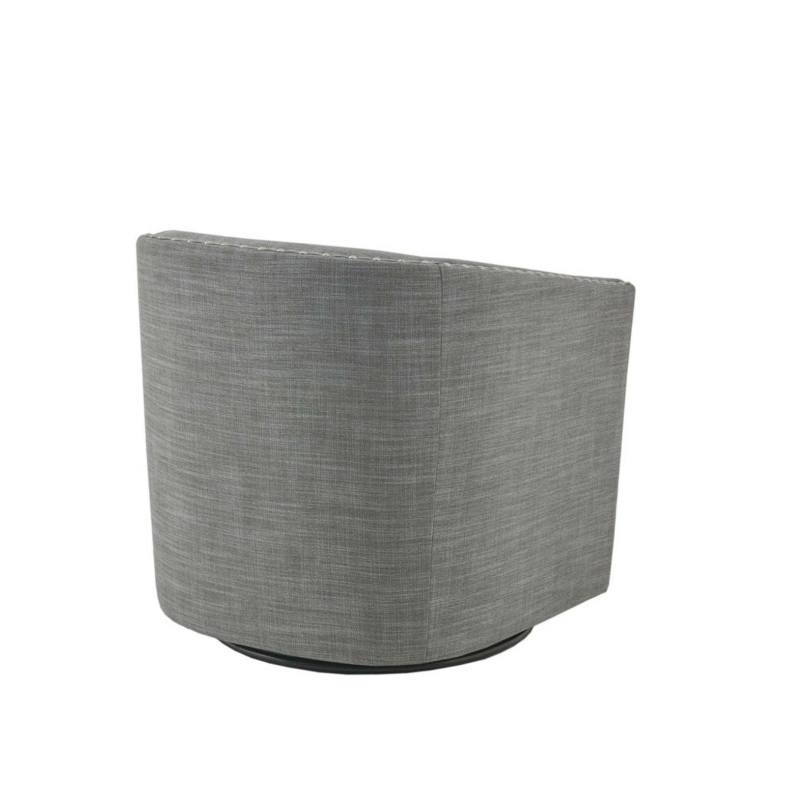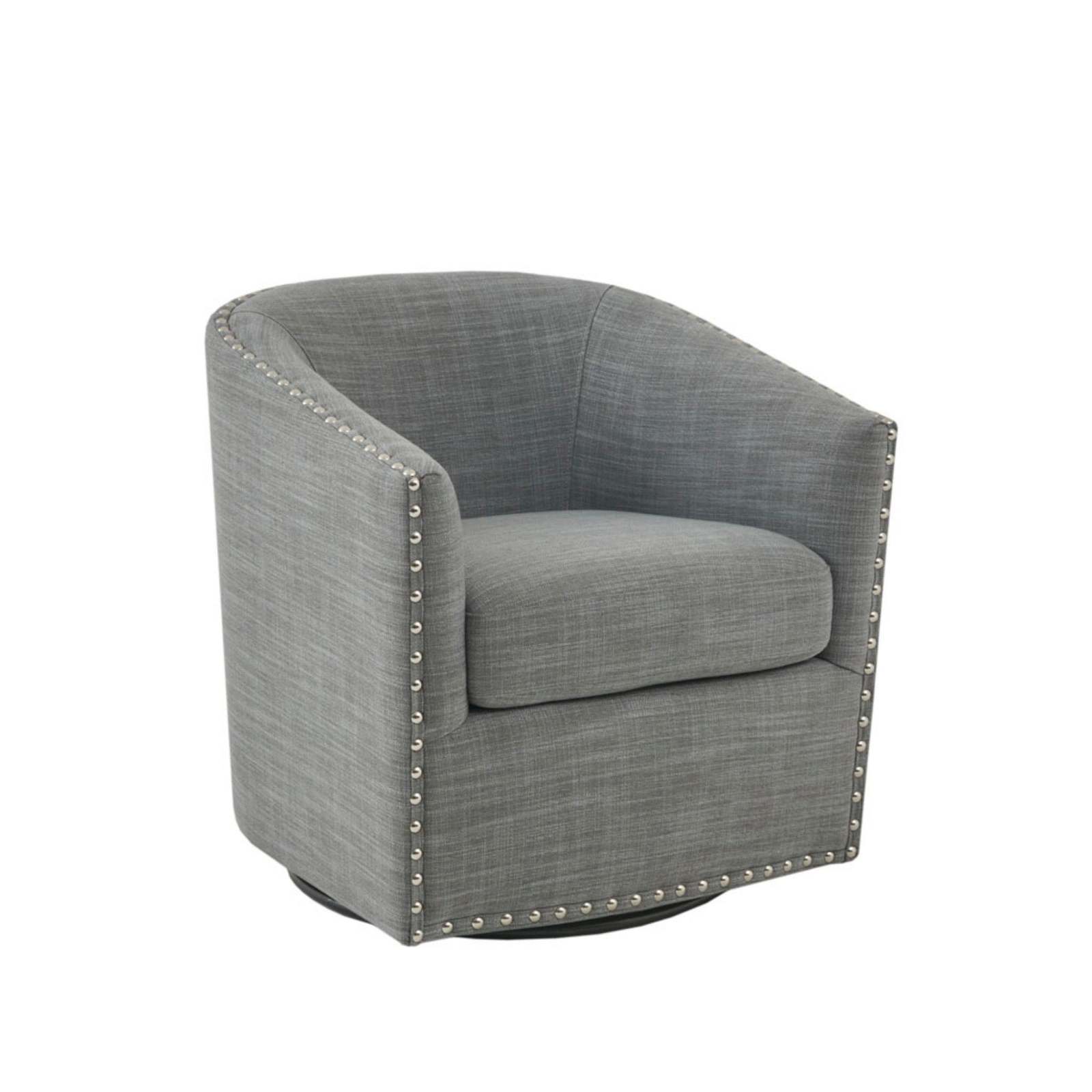 Relax in the comfort and elevate your living room with the Tyler Swivel Chair. Upholstered in a rich grey fabric, this swivel chair features silver nail heads that line the arms and back for an elegant touch. The curved design creates a luxurious silhouette, while the high-density foam cushion provides a deep and comfortable seat. The swivel feature allows the lounge chair to rotate 360 degrees on its black metal base. No assembly required.
