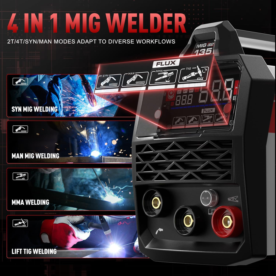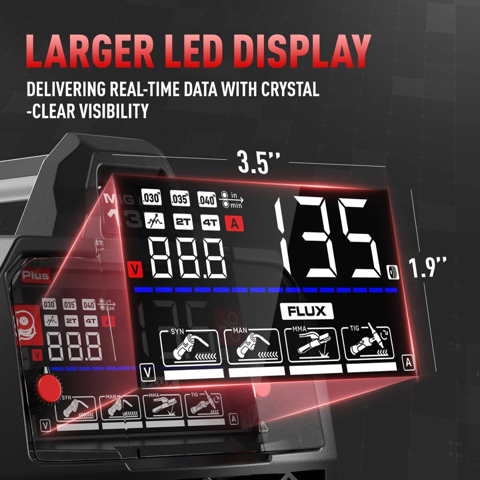 4.1-Inch Precision LED Display with Reinforced Protection: This 135A MIG welder features an oversized 4.1-inch LED screen for crystal-clear visibility, delivering real-time data with pinpoint accuracy?no need to remove your helmet mid-task. The MIG welder machine's transparent protection cover safeguards the welder machine's display against impacts, sparks, and debris, ensuring rugged durability and extended machine longevity for demanding workshop or job-site conditions.