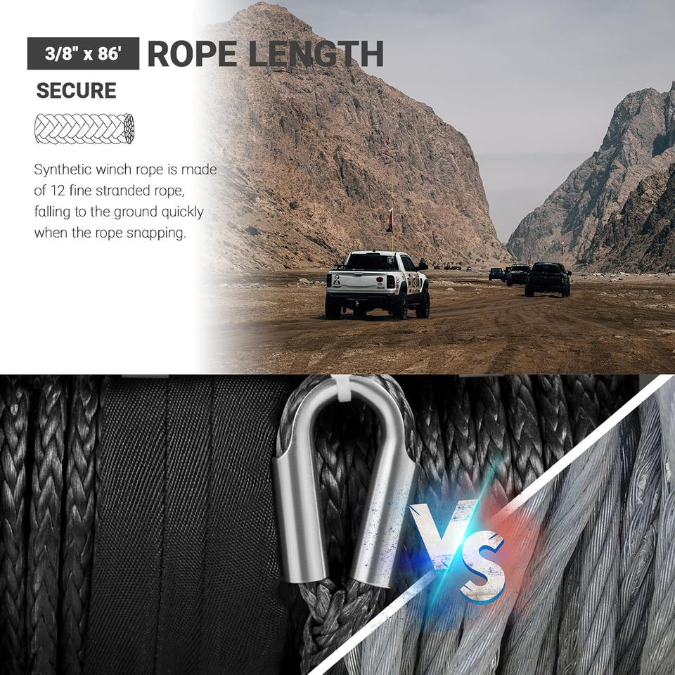 Winch Synthetic Rope Electric Power Winch Waterproof IP66 with Wireless Remote and Handheld Corded Switch for Truck SUV Pickup Trailer Offroad Recovery Equipment