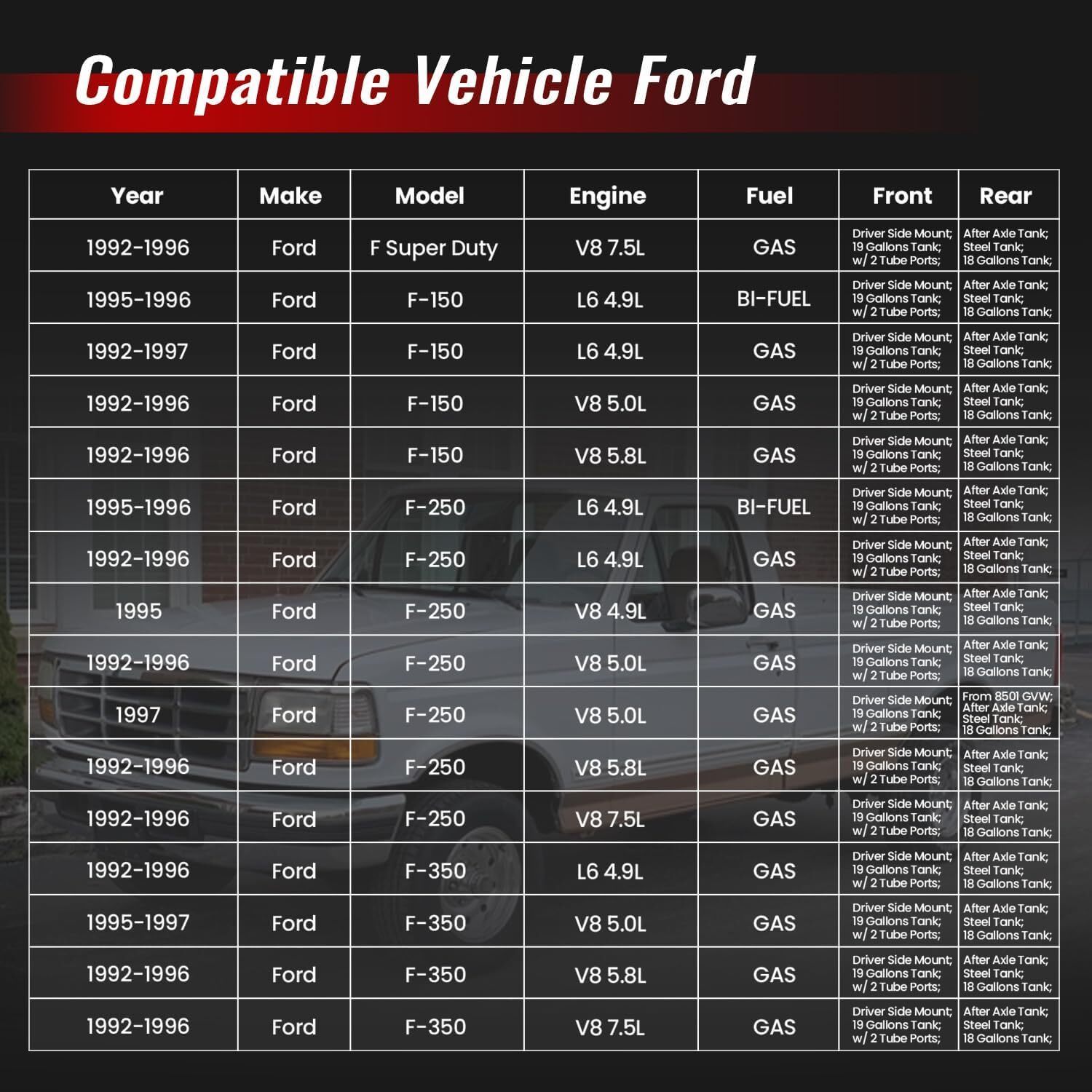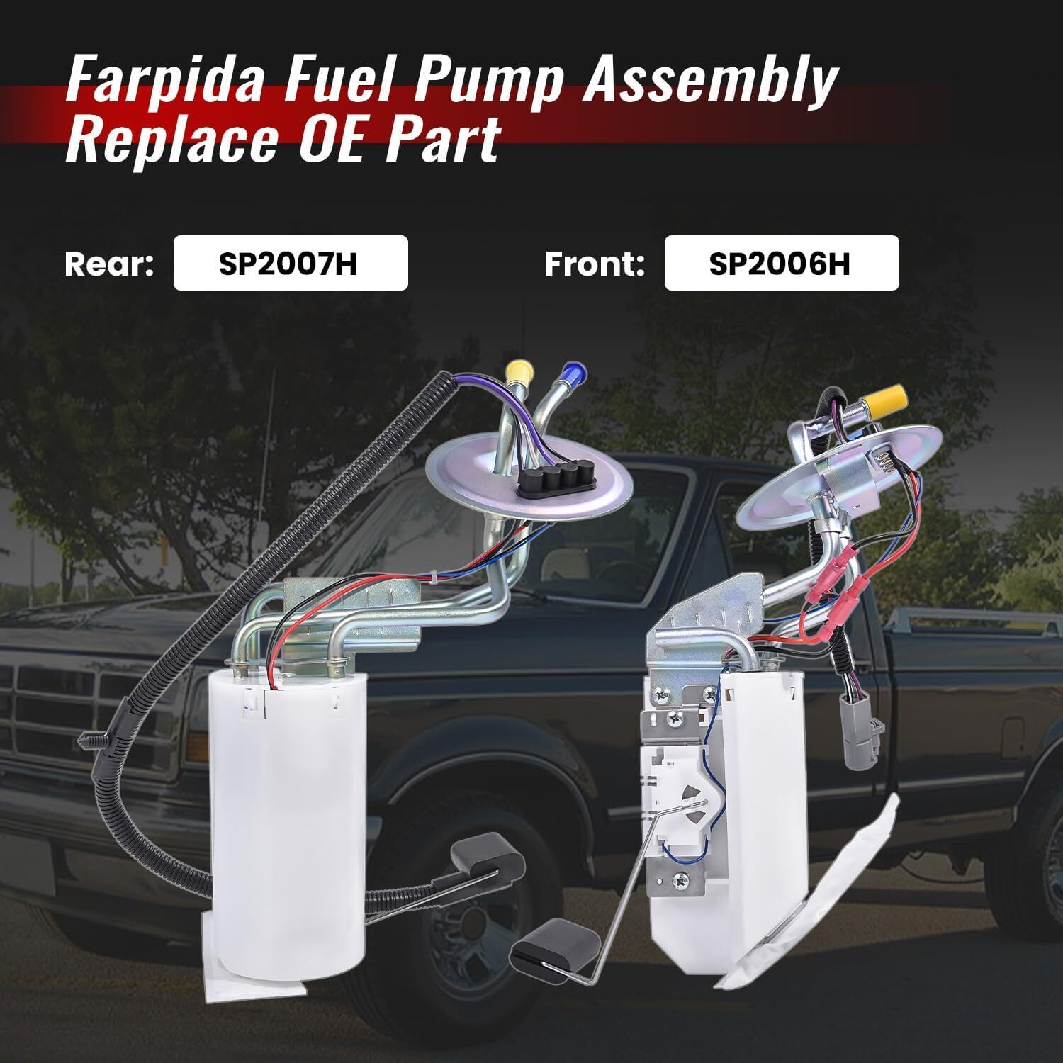 ?High Quality? SP2006H SP2007H Rear ?Front Fuel pump components are manufactured and tested to the same exacting quality standards as our OE fuel pumps to ensure long, reliable service life. ?Replaces Part?Fuel Pump Assembly replace ?Front:310GE SP2006H, Rear:309GE SP2007H. ?Compatible Vehicle ? SP2006H SP2007H Rear ?Front Fuel Pump Assembly fit for 1992-1997 Ford-F150 L6 4.9L V8 5.0L V8 5.8L ,for 1992-1997 Ford-F250 L6 4.9L V8 5.0L V8 5.8L V8 7.5L,for 1992-1997 Ford-F350 L6 4.9L V8 5.0L V8 5.8L V8 7.5L Please scroll down for details of the models. ?Features?The SP2006H SP2007H fuel pump is to suck fuel from the tank, pressurize it and deliver it to the fuel supply line, and work with the fuel pressure regulator to build up a certain fuel pressure. Maximize the performance of your car. ?Quick and easy plug-in installation?Direct replacement vehicle specific kit: replace all worn parts including fuel pumps, tank seals, components, etc. in one go with our comprehensive installation kit. ?Warranty?Farpida's fuel pump assembly module comes with a 1-year warranty. If your fuel pump fails, please contact us immediately to resolve the problem for you.