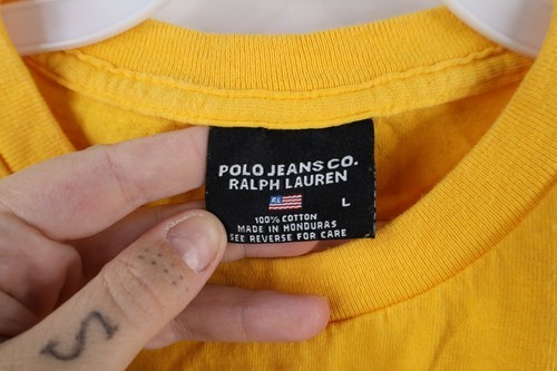 Vintage 90s Ralph Lauren Mens Large Faded Spell Out Big Logo Flag T-Shirt Yellow
