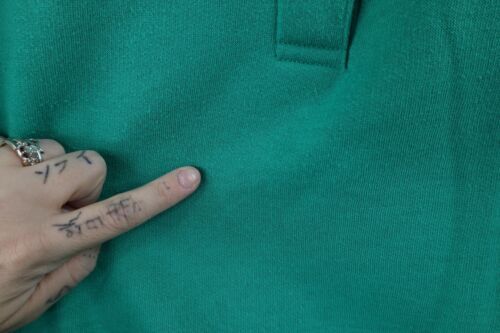Dark spots front bottom. Pilled. Has color fade. Missing string in the collar.