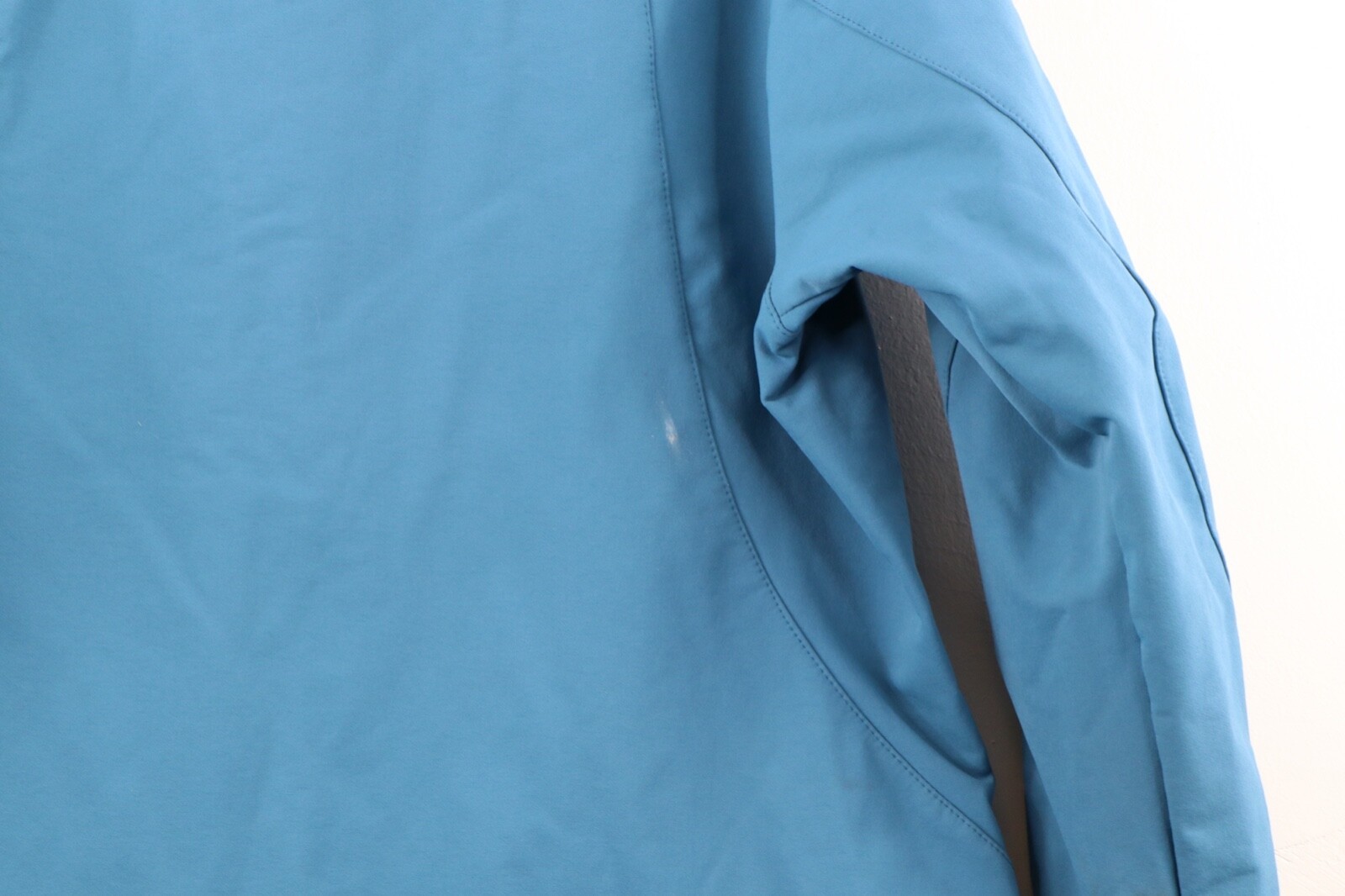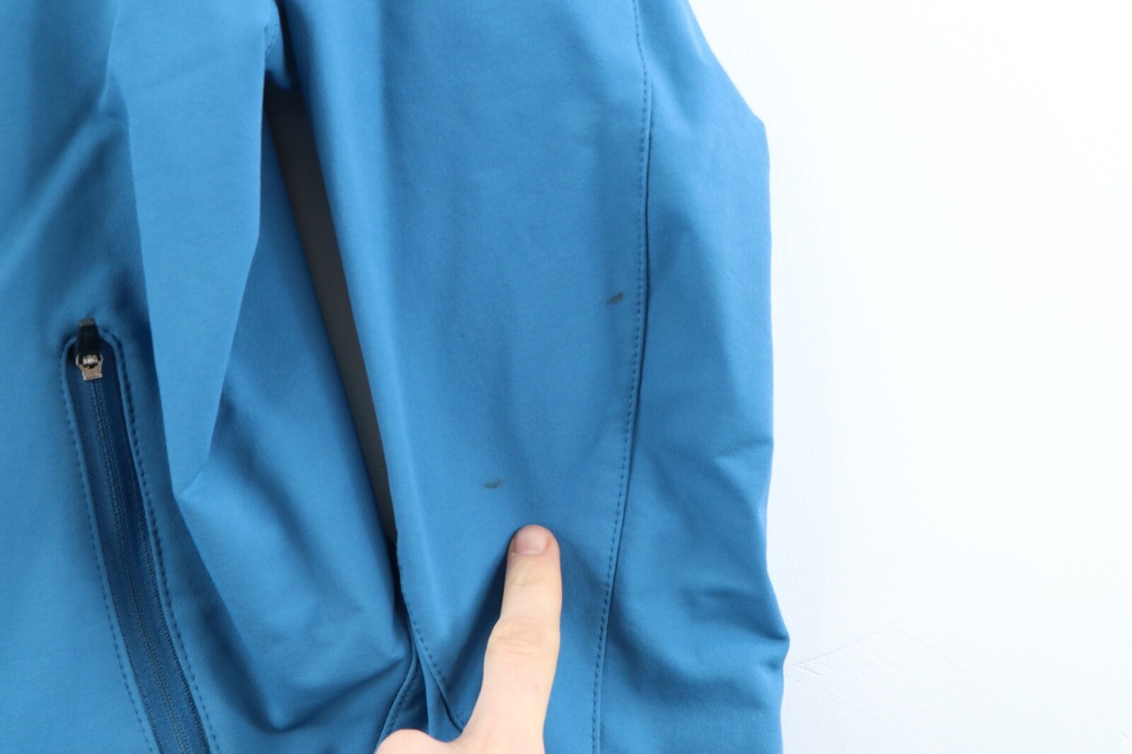 Comes from a smoke-free household. Has blemishes on the front, cuffs, inner collar and back