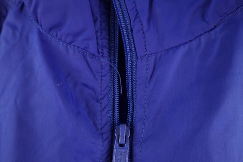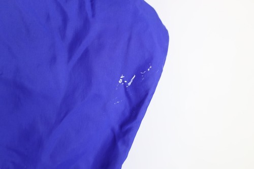 Stains left arm/cuff. Loose threads cuffs, front top, logo. Fabric pulls right arm. Elastic on cuffs is stretched