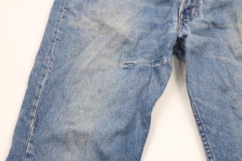 Thrashed. Holes in the crotch/backside. Mended cut on the upper right front leg. Distressed and faded. USA made