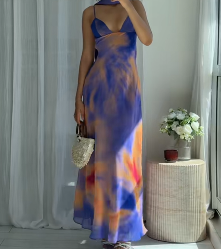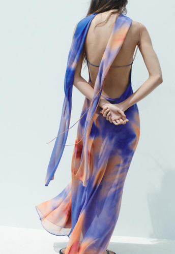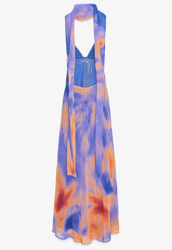 ZARA BNWT 2025. BLUE ORANGE LONG TYE DIE PRINT SCARF DRESS STRAPS. 8221/119/948