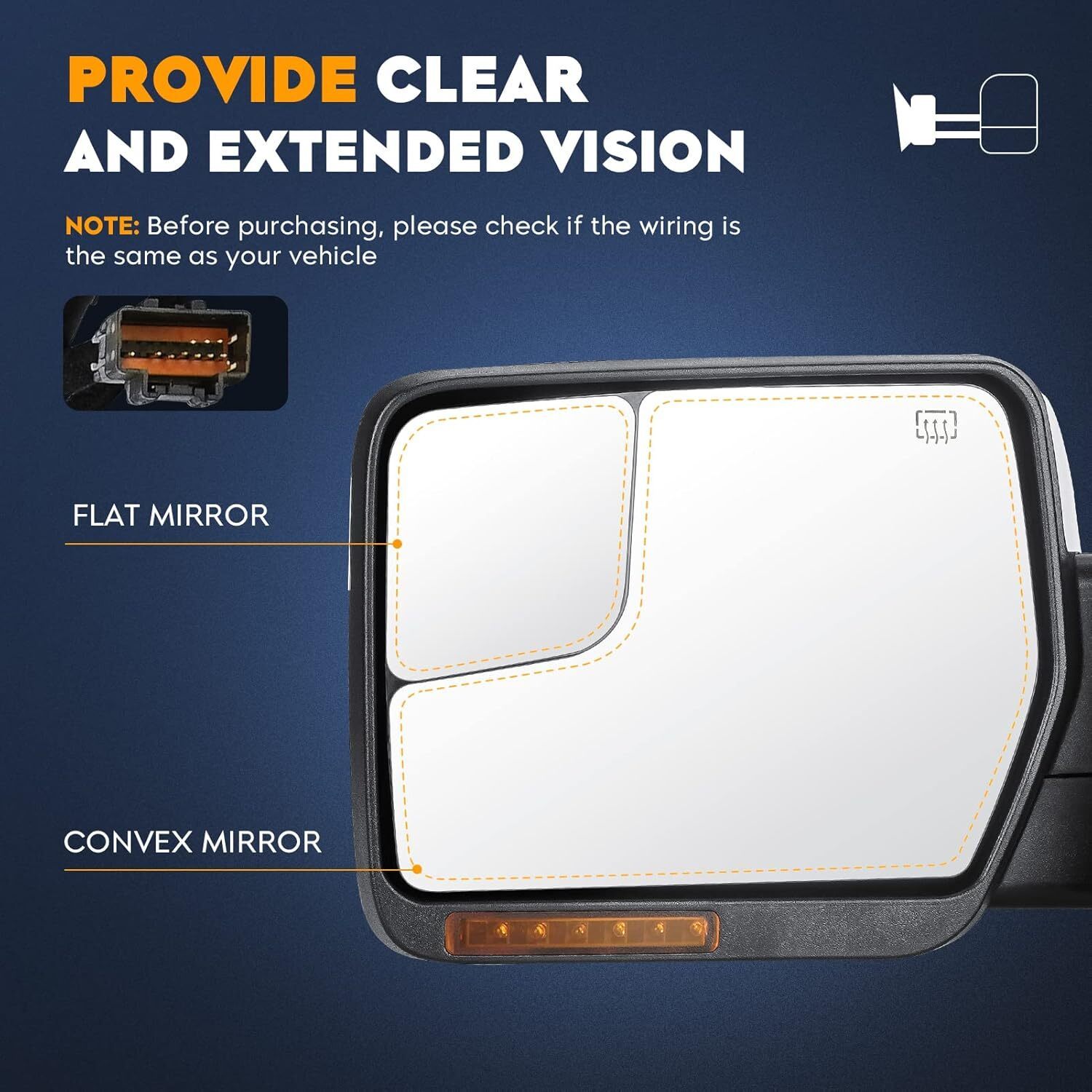 ?Towing Mirrors Fitment: For Ford F-150 2004 2005 2006 2007 2008 2009 2010 2011 2012 2013 2014 ?Function: Mirror front-Amber turn signal; Mirror back-plastic reflective strip, no light; Puddle Light; Manual folding; With heated function; Powered mirrors ?What Included: A Pair of Towing Mirrors (Including driver left side and passenger right side). These towing mirrors are made of high-quality glass and ABS material, which provide clear visibility even in bad weather to ensure your travel safety. ?Note: More comprehensive product information is available in the vehicle model list, pictures, and descriptions. To avoid any inconvenience, kindly confirm that this product is suitable for your vehicle and meets your needs before placing an order. ?If any problems, feel free to contact us. This product involves a variety of functions such as indicators, folding, heating, etc. Please contact me if you do not know how to wire, I will send electronic wiring diagram.