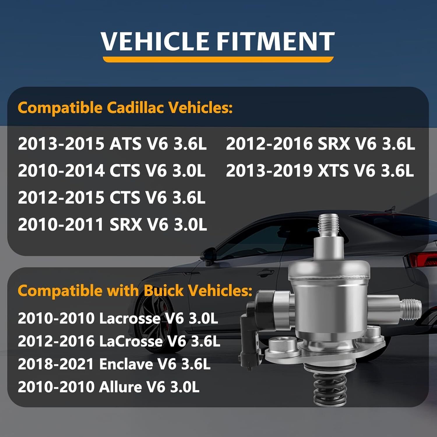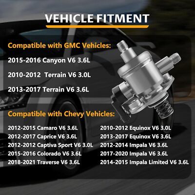 Replaces Number: GDP106, M73113, 12641740, 12622475, 12629934, 12633594, 12669005, 12677328, 12677329, 12691016, HM10007. Please check the part number of original fuel pump before ordering. Vehicle Fitment-1: Compatible with Chevy Camaro V6 3.6L 2012-2015, Caprice V6 3.6L 2012-2017, Captiva Sport V6 3.0L 2012, Colorado V6 3.6L 2015-2016, Traverse V6 3.6L 2018-2021, Equinox V6 3.0L 2010-2012, Equinox V6 3.6L 2013-2017, Impala V6 3.6L 2012-2014, Impala V6 3.6L 2017-2020, Impala Limited V6 3.6L 2014-2015. Vehicle Fitment-2: Compatible with Buick Lacrosse V6 3.0L 2010, LaCrosse V6 3.6L 2012-2016, Enclave V6 3.6L 2018-2021, Allure V6 3.0L 2010-2010; Compatible with GMC Canyon V6 3.6L 2015-2016, Terrain V6 3.0L 2010-2012, Terrain V6 3.6L 2013-2017. Vehicle Fitment-3: Compatible with Cadillac ATS V6 3.6L 2013-2015, CTS V6 3.0L 2010-2014, CTS V6 3.6L 2012-2015, SRX V6 3.0L 2010-2011, SRX V6 3.6L 2012-2016, XTS V6 3.6L 2013-2019. Precision Design: Using precise manufacturing technology to ensure perfect compatibility with the vehicle's fuel system, it can operate under high pressure, ensuring that your engine achieves the precise fuel required for peak performance.