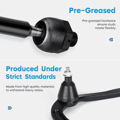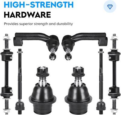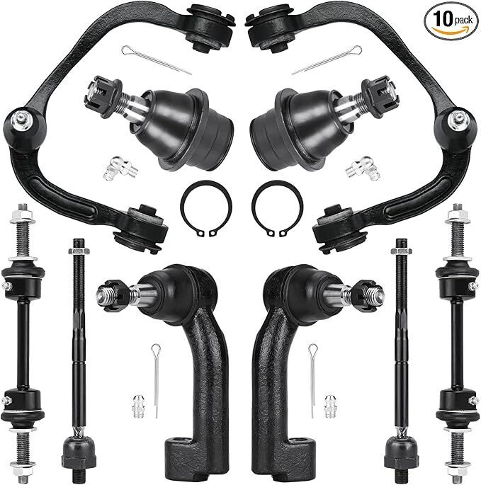 Kit Includes: 1x Front Left Upper Control Arm [w/ Ball Joints], 1x Front Right Upper Control Arm [w/ Ball Joints], 2x Front Stabilizer Sway Bar Links, 1x Front Right Outer Tie Rod Ends, 1x Front Left Outer Tie Rod Ends, 2x Front Inner Tie Rod Ends, 2x Front Lower Ball Joints Compatible with: for Ford F150 2009-2014 (4X4; Not for Raptor Models) Replaces for Part Number: 9L3Z-3085-A, 7L1Z-3084-A, 7L1Z-3085-A, 7L1Z3A130R, 7L1Z3A130L, 7L1Z3280A, 7L1Z3050B; Also replaces K80306, K80308, K750362, ES800514, ES800515, EV800457, K500008 High Quality: Be made of premium quality material and undergo impact, wear and fatigue testing to help ensure quality and durability. Quality: tested before shipping.