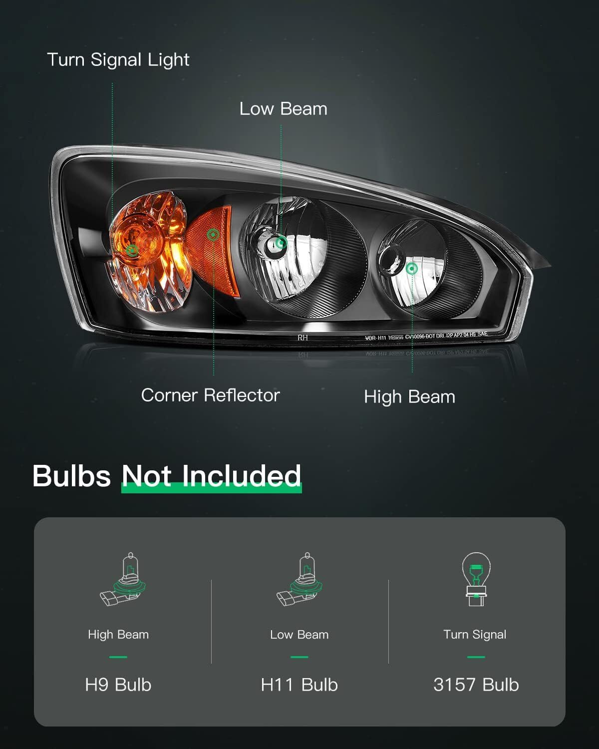 Compatible With -Black Housing Amber Reflector Clear Lens Headlights fit For Chevrolet For Malibu 4-Door 2004 2005 2006 2007 2008 OEM:15851373 Direct Fit - Light Source Type: High Beam:H9 / Low Beam:H11 / Turn Signal:3157 Plug-and-Play installation.There's no need for any modifications,direct replacement for factory-installed headlights. High Performance - Brand new lens with good light transmission ensure a superior bright view in day night.ABS housing with good impact tolerance and heat tolerance Multiple Experiment - Temperature Humidity Experiment ensure that the unit can withstand a wide range of temperature without reduce light output security. dirt Experiment ensure the unit is properly sealed against harmful road dirt .Fog Experiment ensure that the unit do not cause moisture buildup leading to reduce visibility DOT and SAE Compliant - Meets DOT SAE Compliance Standards.Comes with Driver and Passenger Side Headlights