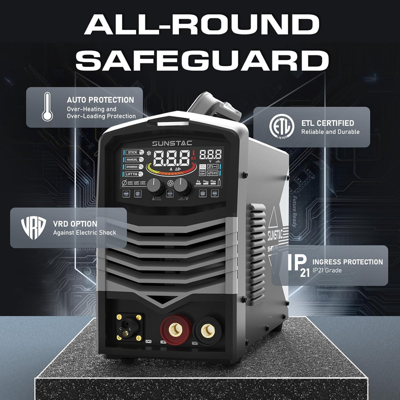 ?Intelligent Synergic Control?Sunstac 180A MIG welder possesses IGBT and integrated wire feeding technology, which is tailored for whom that looks for a simple and user-friendly MIG welding machine. With its intelligent synergic mode, the wire feeding speed and voltage will be automatically adjusted by regulating the current