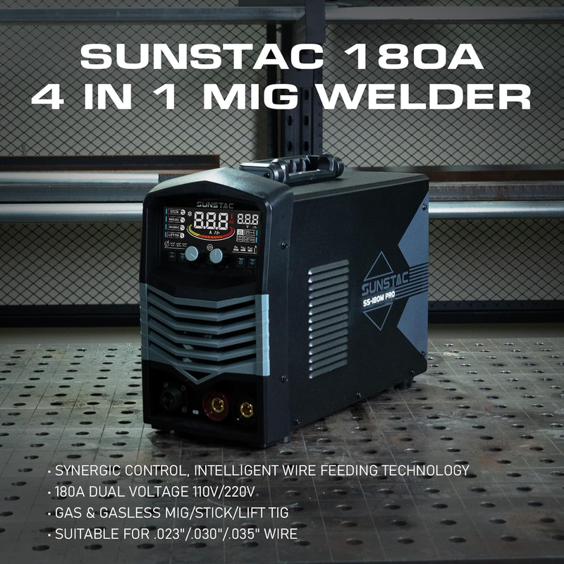 ?4 IN 1 SMART WELDER?The SS-180M PRO MIG welder offers 4 welding options: MIG, Gasless MIG, Stick, Lift TIG (TIG Torch NOT included in pack). Maximum current is 180Amps, supporting .023" (0.6mm) .030" (0.8mm) and .035" (0.9mm) mig wires. The MIG/Flux Core welder is capable for welding stainless steel, carbon steel and even thicker steel. Ideal for home maintenance, yard repairs, farm and road equipment fixing