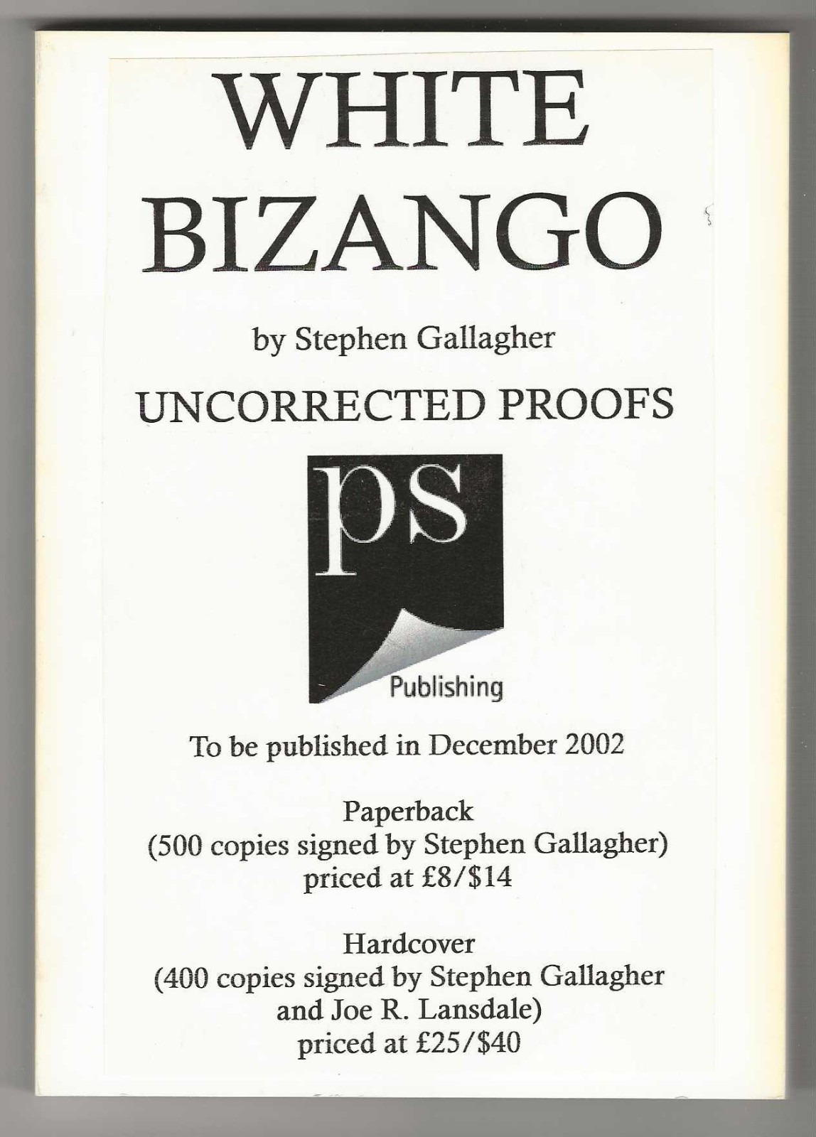 Stephen Gallagher White Bizango First edition Advance Uncorrected Proof Horror