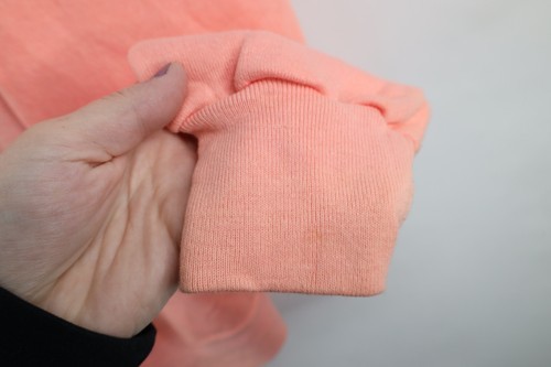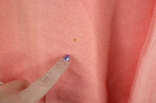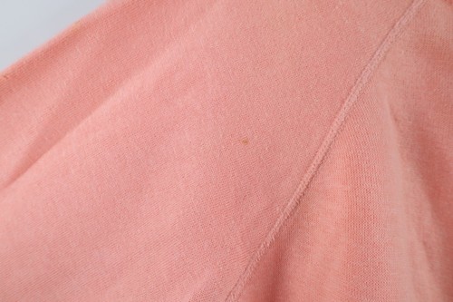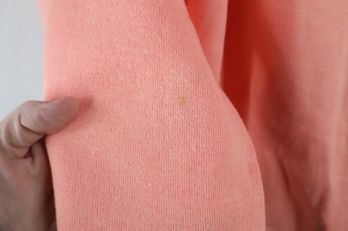 Stains front, back, both arms. Has pilling. Color faded. Has musty scent. USA made