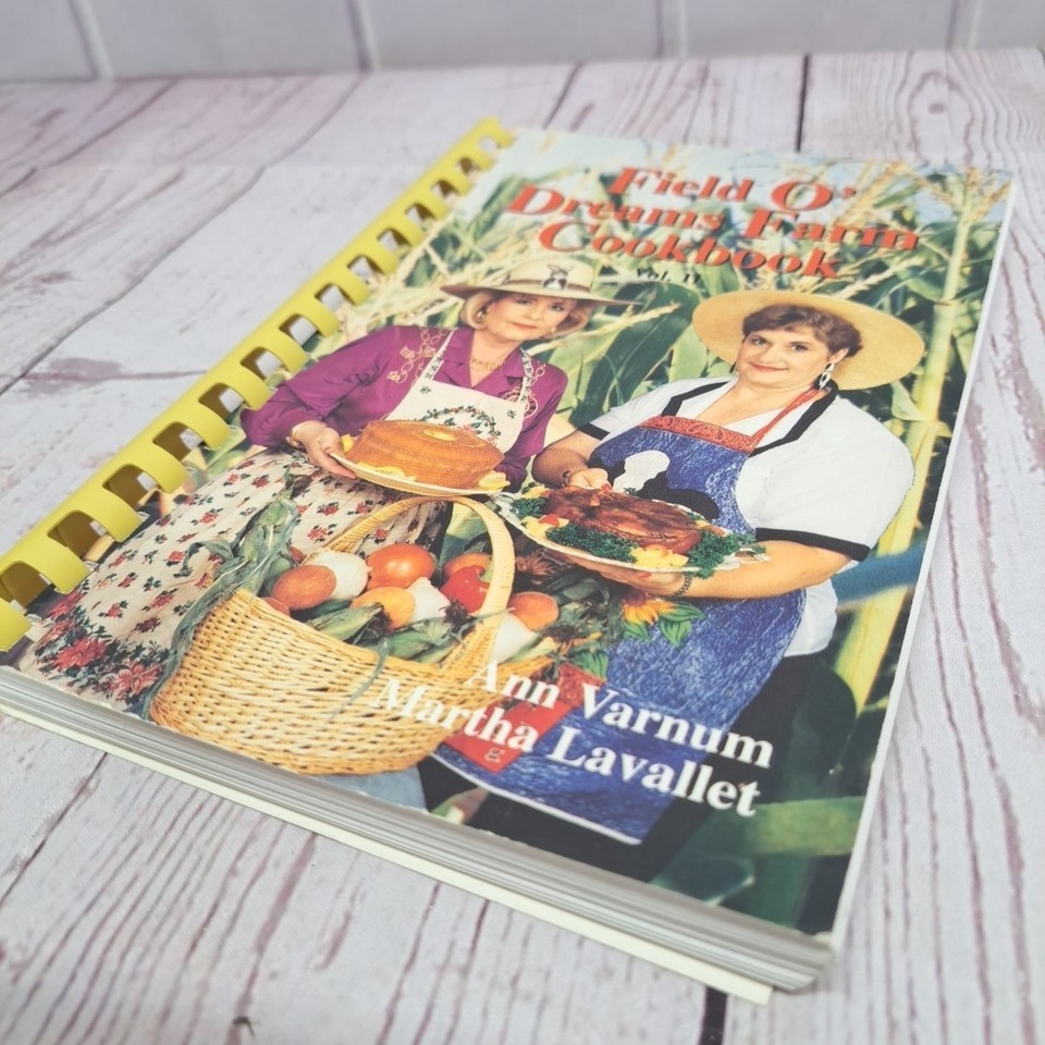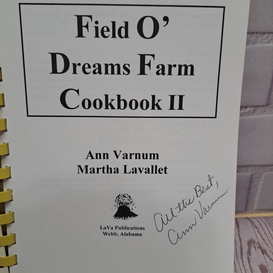 The product is a signed copy of the "Field O' Dreams Cookbook" by author Ann Varnum. Published in 1993 by LaVa Publications in the United States, this plastic spiral-bound paperback cookbook focuses on cooking and features recipes in English. With a nostalgic feel and unique design, this cookbook captures the essence of traditional American cuisine with a touch of whimsy, making it a special addition to any culinary collection.