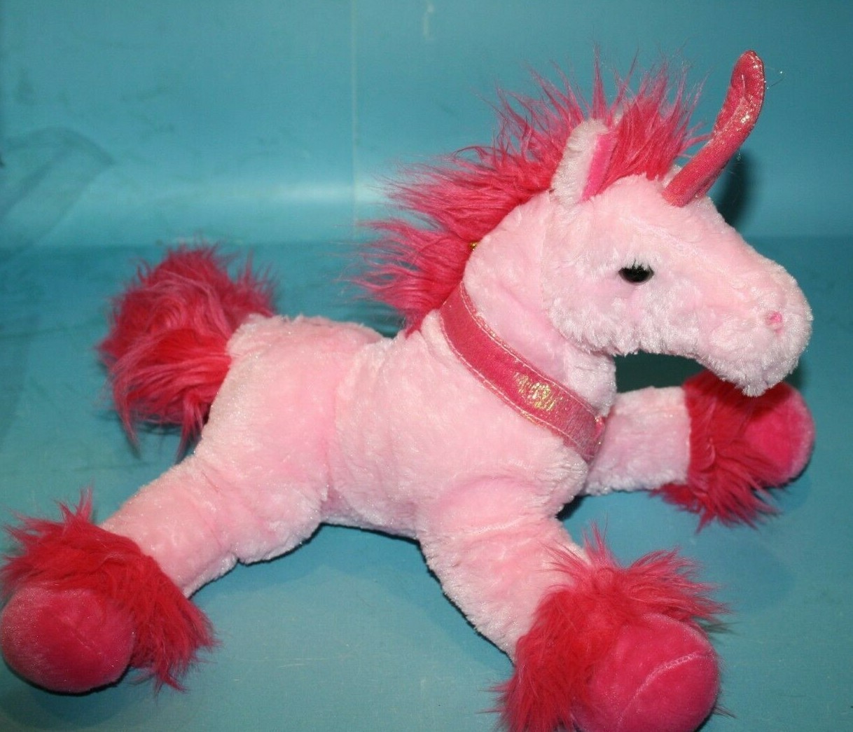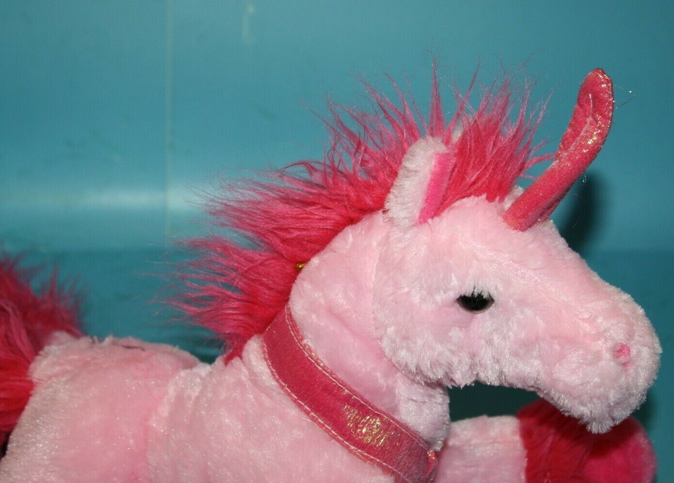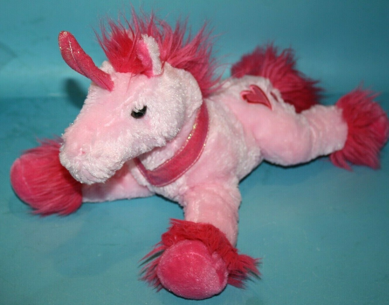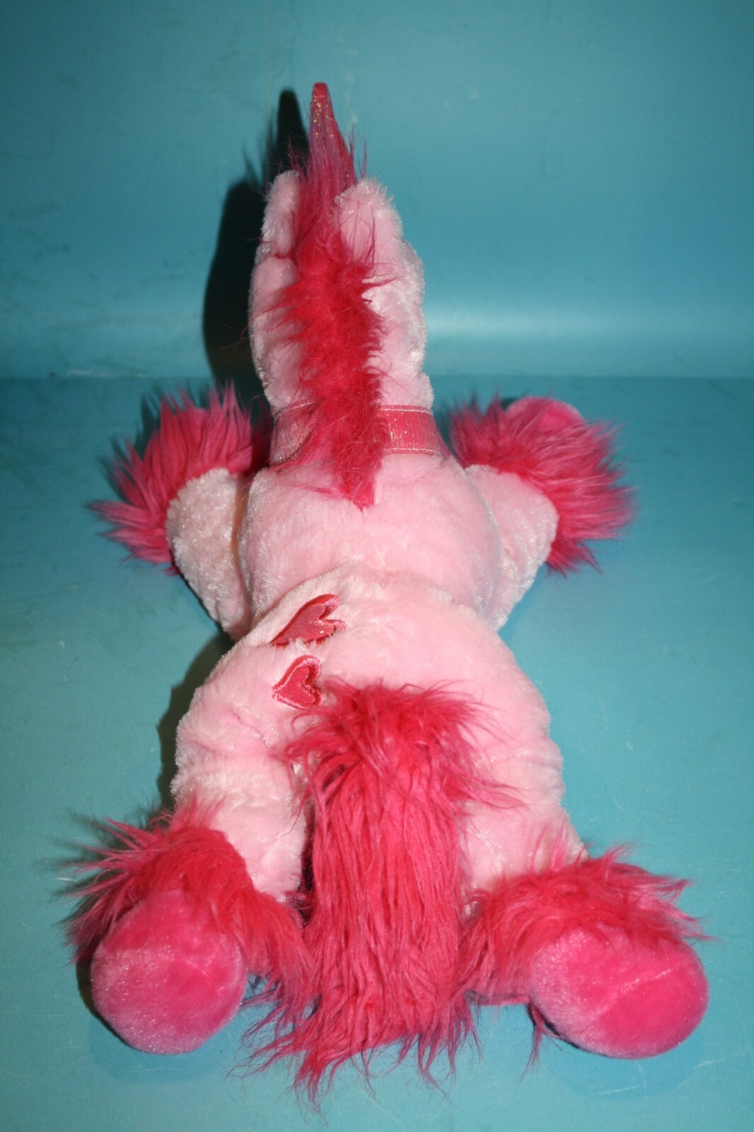 Features: Soft hot pink and pink plush material, Iridescent horn and hearts on rump and collar, Plastic Eyes, Soft Stuffed