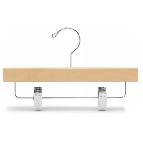 These 11" children's wooden pant/skirt hangers come with chrome swivel hooks and adjustable non-staining clips for hanging. Each polished chrome clip comes with clear soft rubber cushions to protect your childs pants and skirts from snags or tears. These wooden pant hangers are coated in multiple layers of clear varnish for durability and years of use.