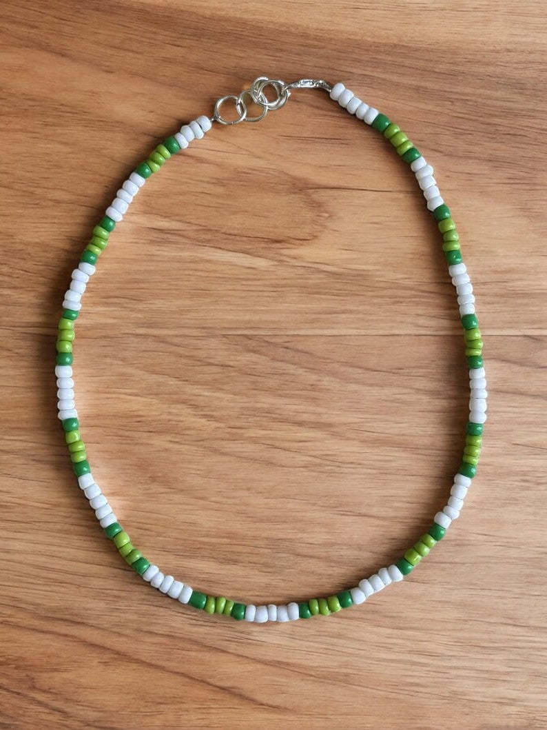 This chic, handcrafted necklace features slender green and white beads, creating a vibrant yet understated look. Its delicate design makes it perfect for layering with other necklaces or wearing solo for a simple, elegant touch. Ideal for everyday wear or special occasions, this necklace adds a refreshing pop of color to any outfit.