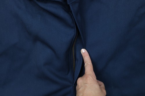 Blemishes, discoloring, loose threads throughout. Inner lining, cuffs discolored. Color faded. Made in USA