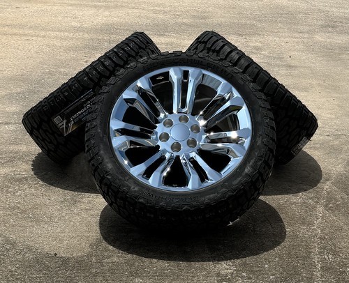 New Set Of Four GM Style Replica 22" Chrome Seven Split Spoke Wheels With New Blackhawk Ridgecrawler R/T 33X12.50R22 Tires.