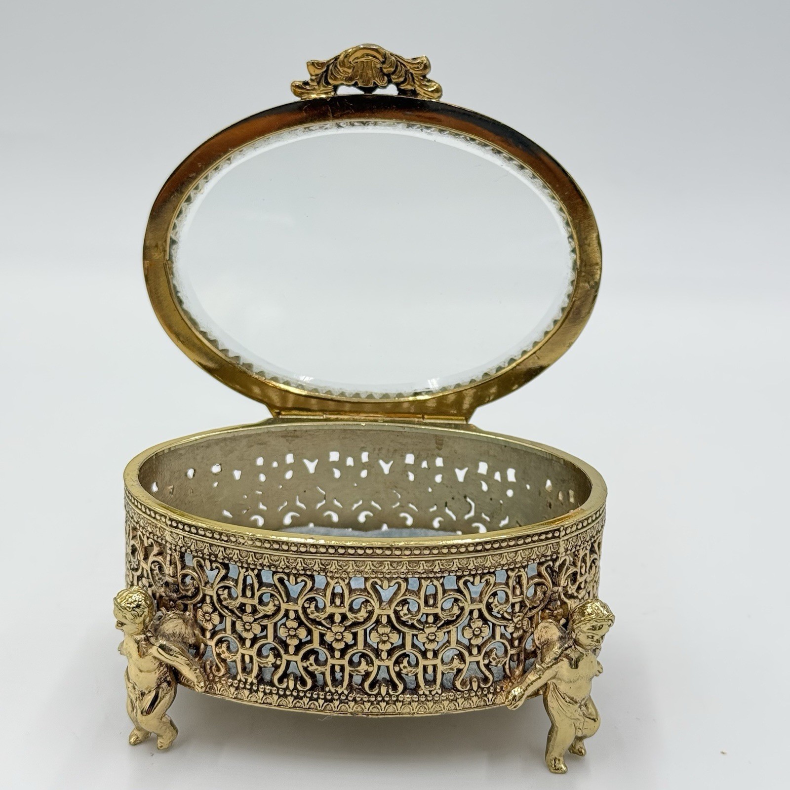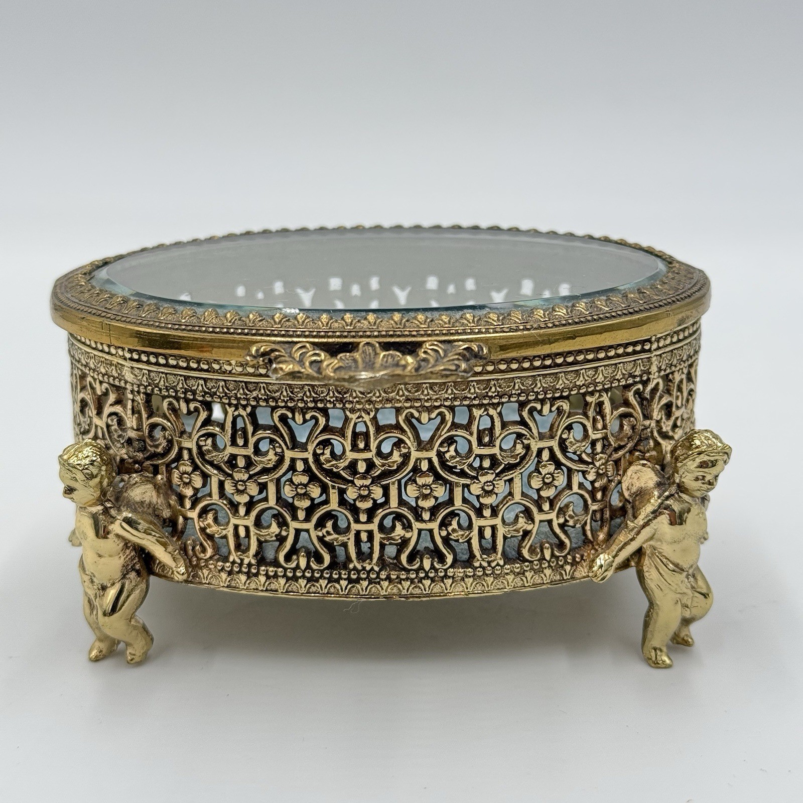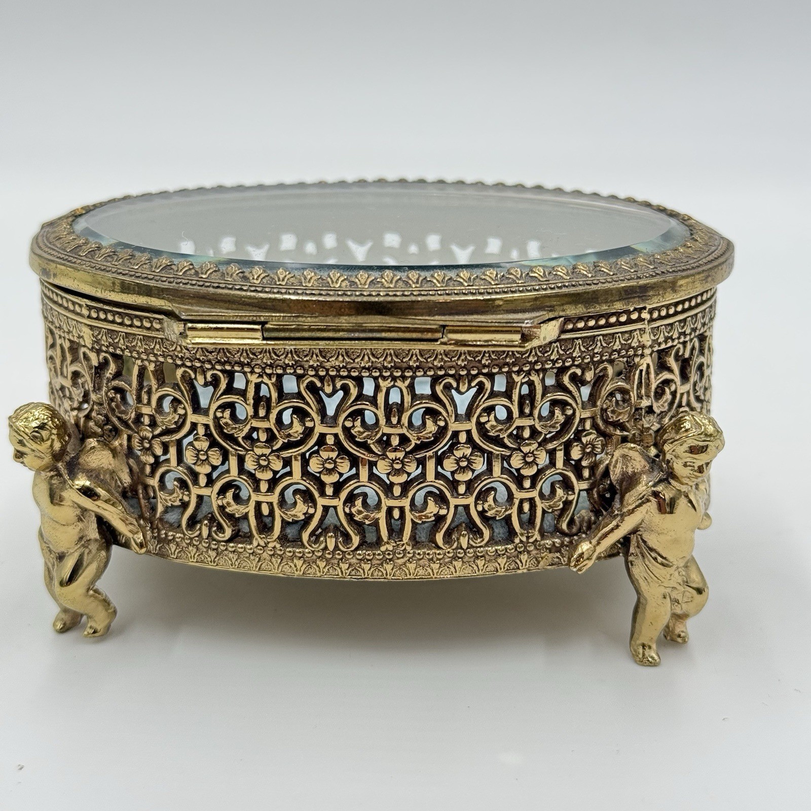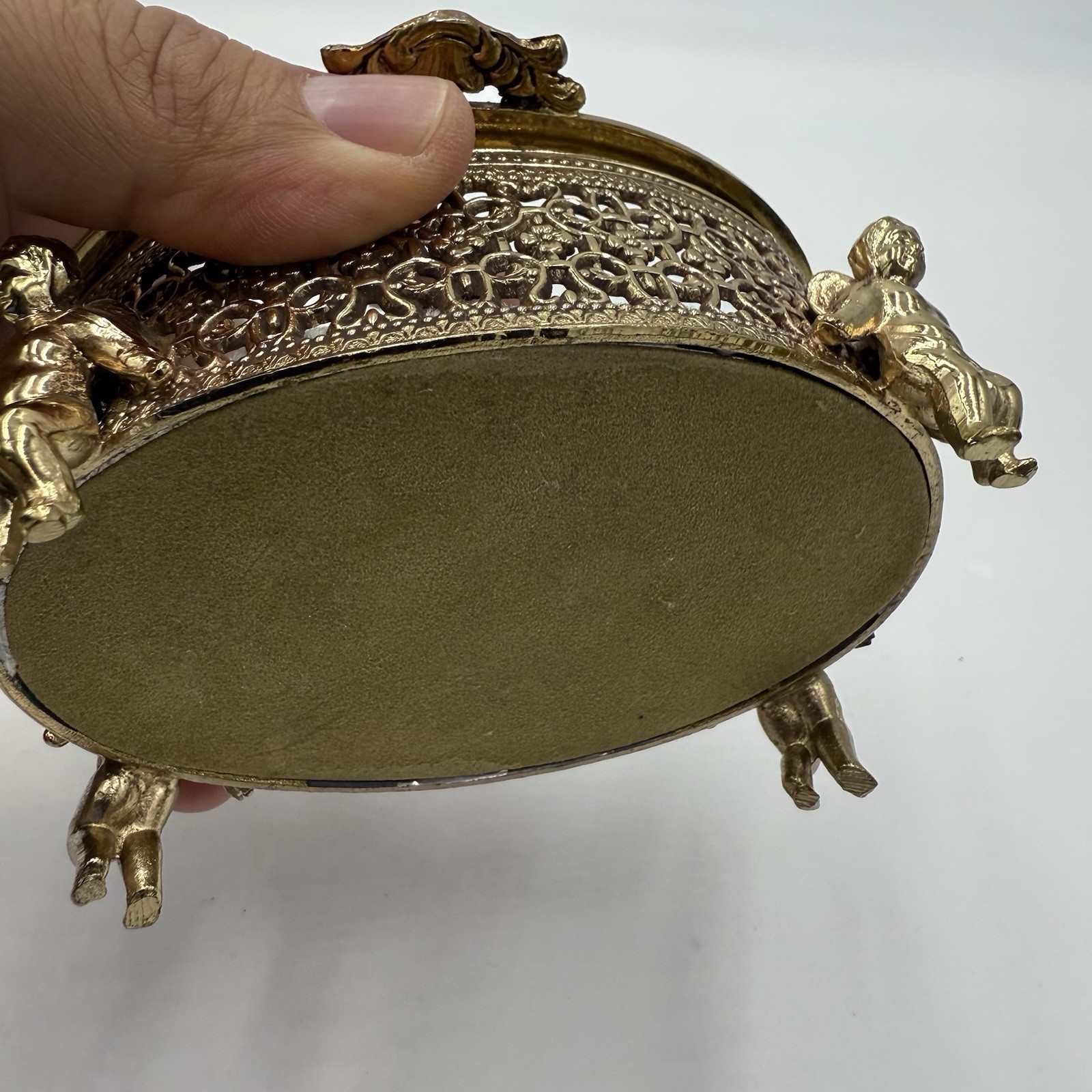Vintage Gold Filigree Oval Ormolu casket Hollywood Regency style Cherubs Footed