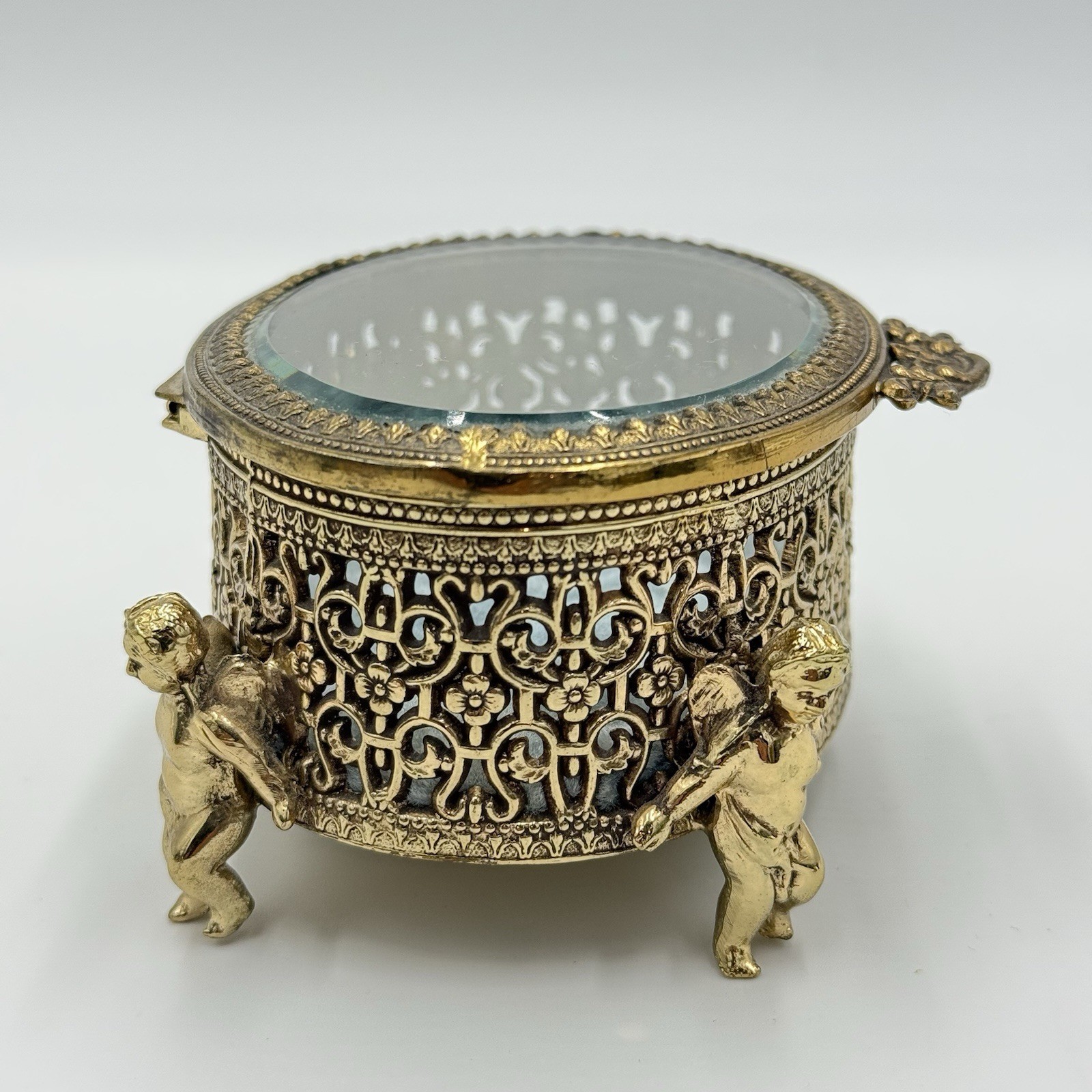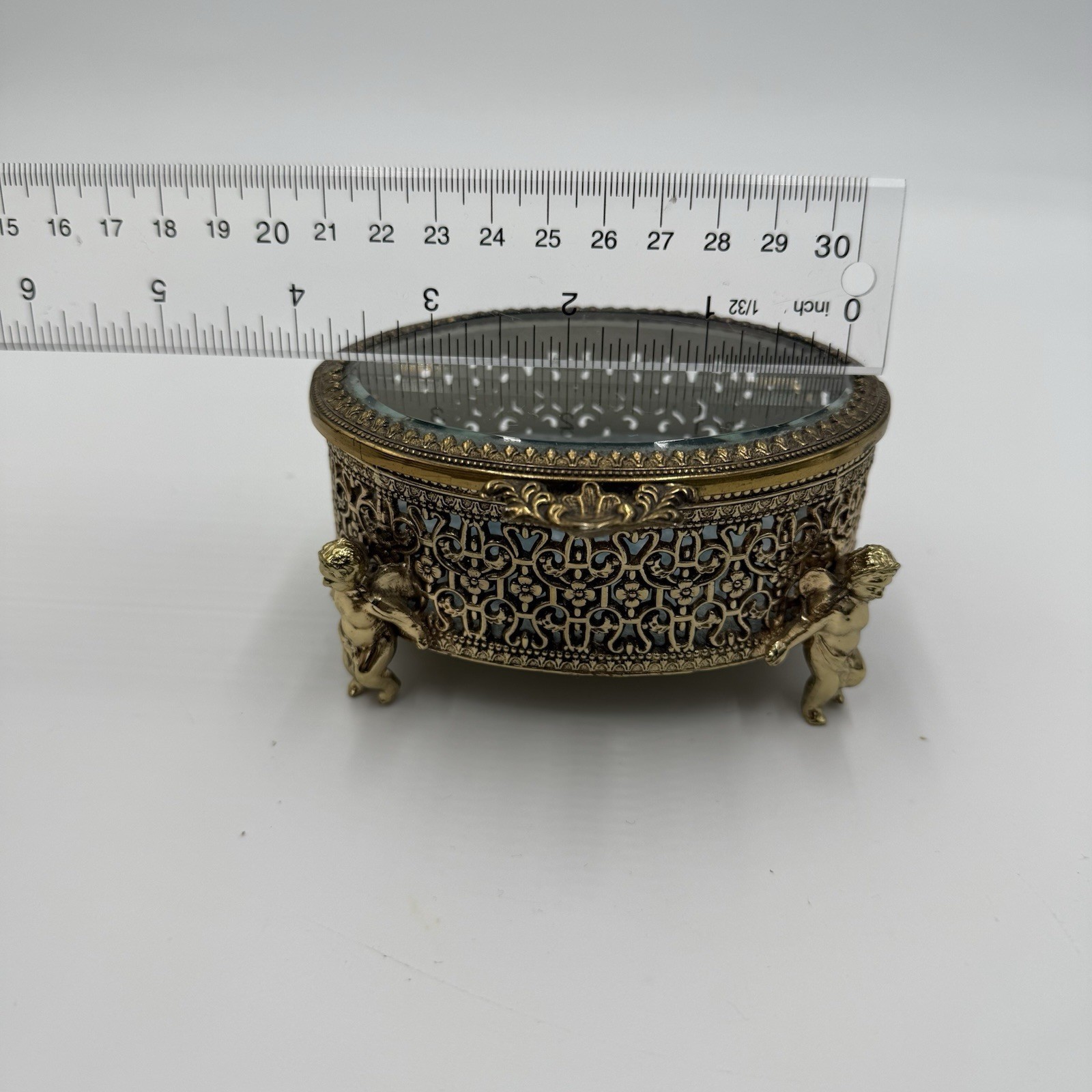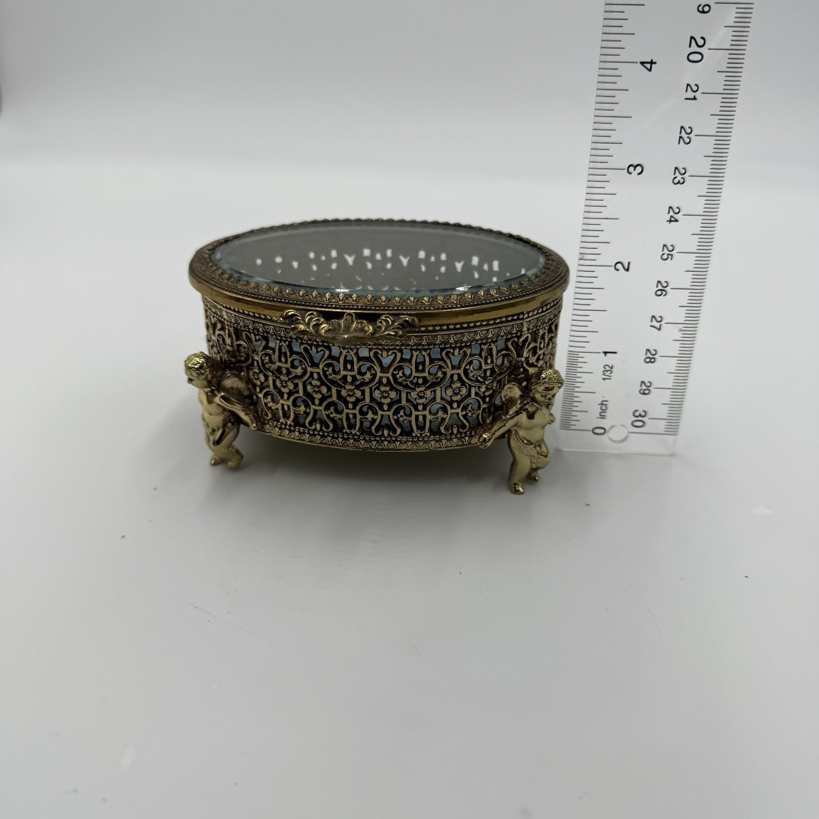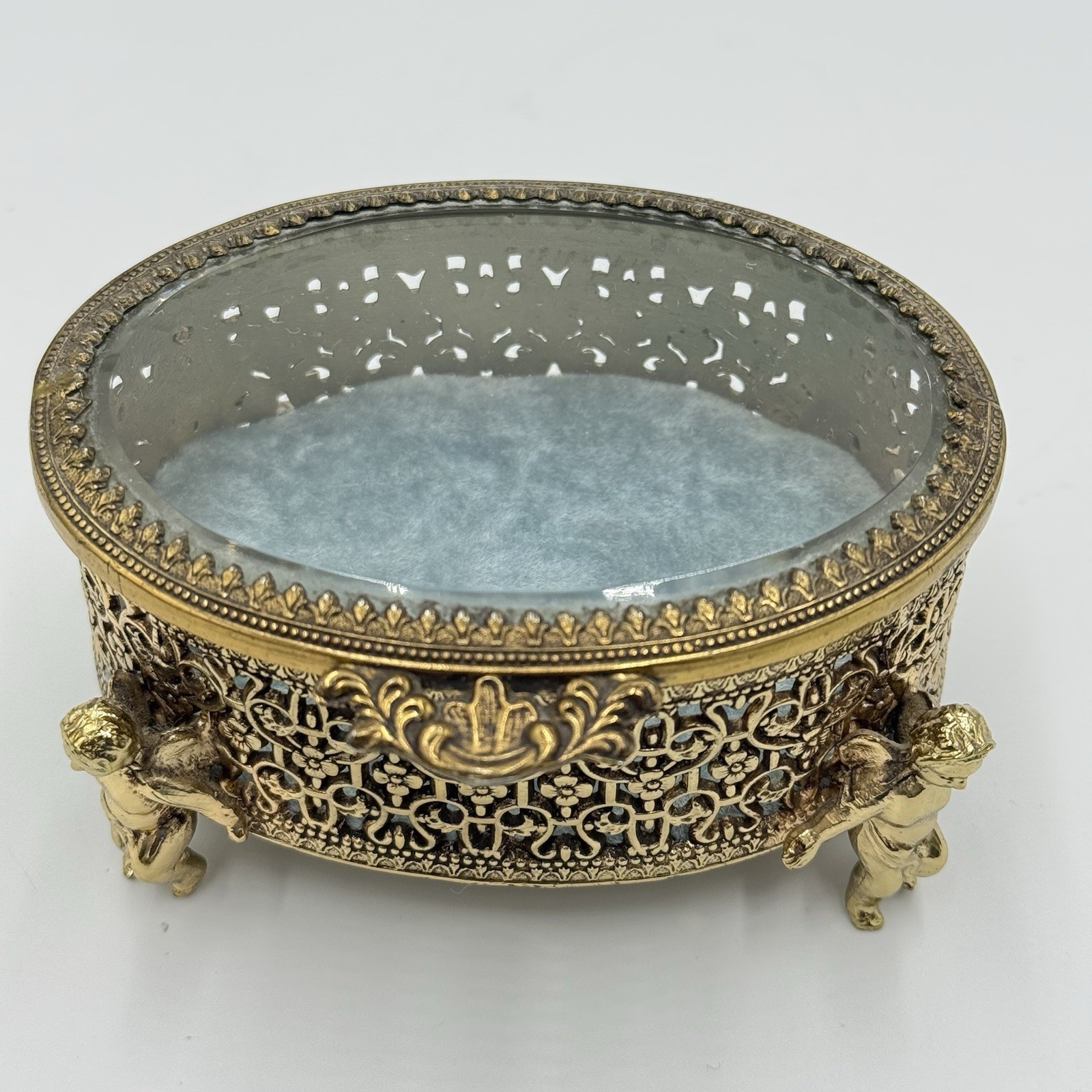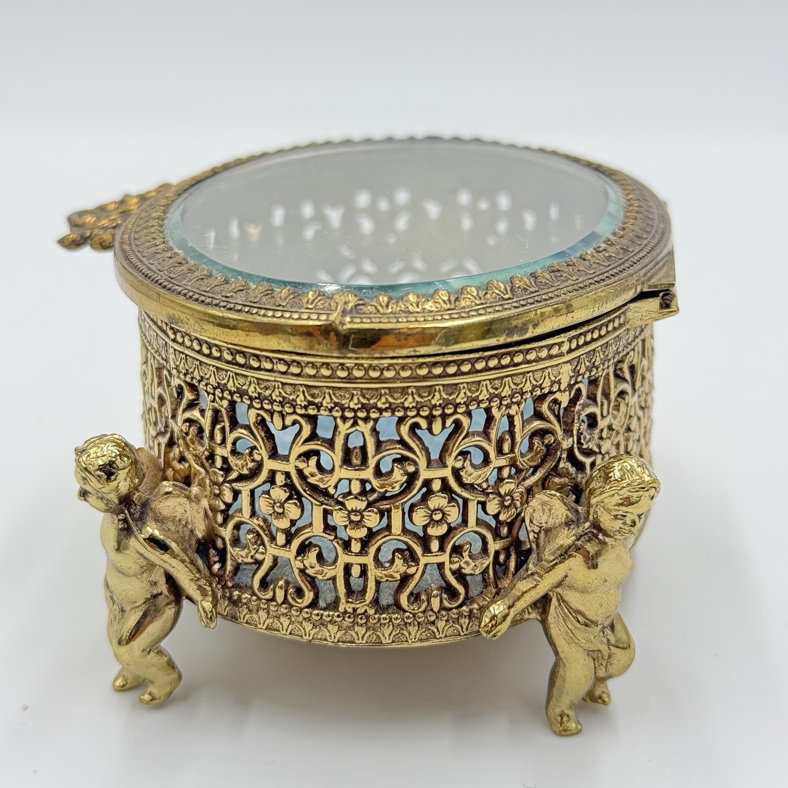 Vintage Gold Filigree Oval Ormolu casket Hollywood Regency style Cherubs Footed