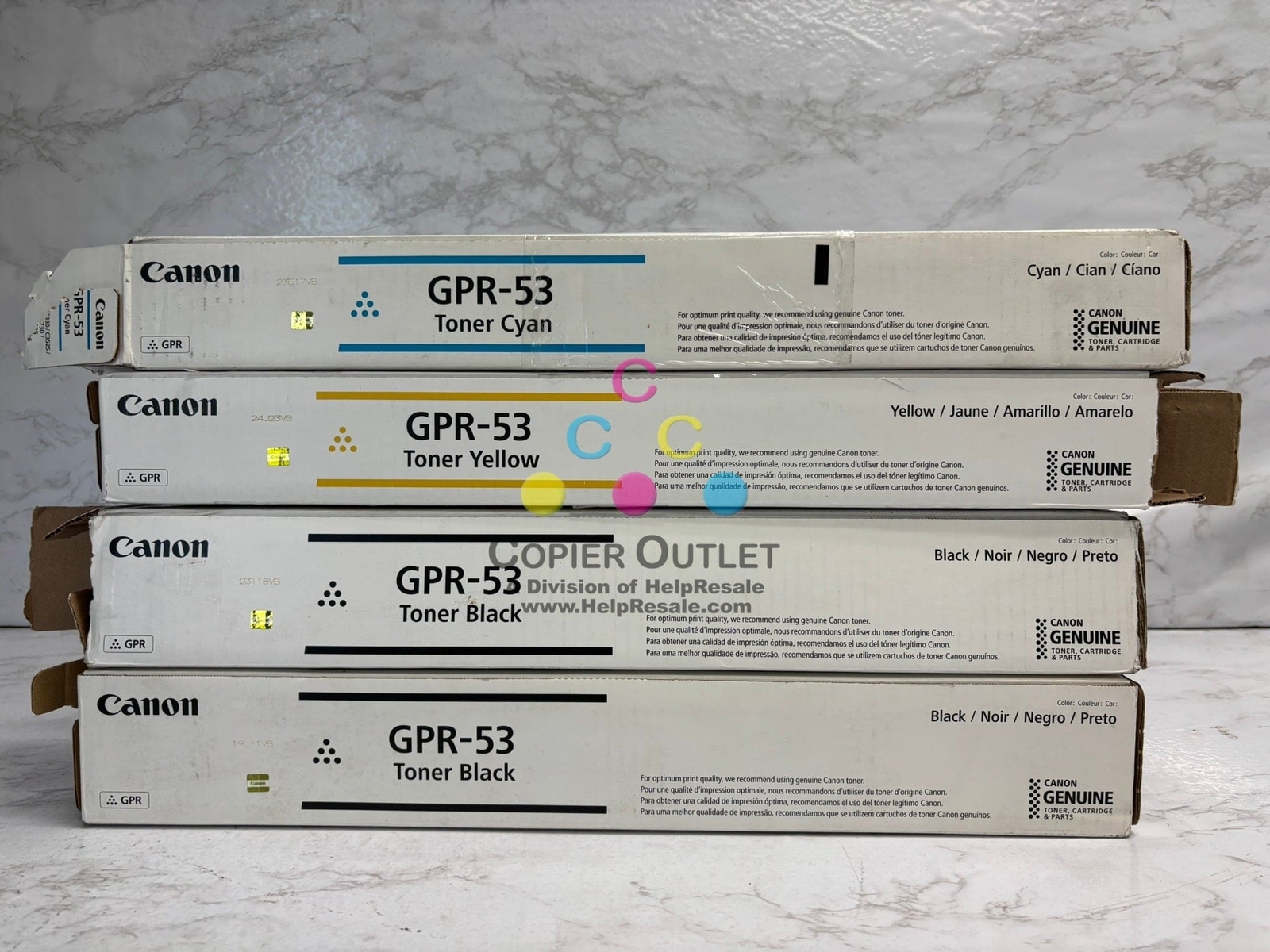 4 Genuine Open GPR-53 CYKK Toners GPR-53C (Open box) x1, GPR-53Y (Open box) x1 GPR-53K x2 (1 Open box, 1 Sealed) New - Open Boxes FOR: Canon imageRUNNER ADVANCE C3325iC3330i, C3525i,C3525i II,C3525i III,C3530i,C3530i II, C3530i III DX C3725i,DX C3730i,DX C3826i,DX C3830i,DX C3835i Same Day Shipping (For faster shipping service, please contact us.) Listed by: Vienna (Sales Team) "Hope is the most exciting thing there is in life" - Mandy Moore (A positive moment brought to you by Help Resale) Copier Outlet (A Division of Help Resale) Copier Outlet was established in 1993. We buy and sell both domestically and internationally and have wide assortment of copiers, consumable and accessories of all popular brands. All of our copiers are in house and available for your inspection. They all have been tested and rated for functions, cosmetics and overall appearance. Our consumable and accessories selections include toners, imaging units, developers and copier parts such as fax board, fixing unit, fuser unit, roller, cleaning brush, drum blades and etc. For more detailed information on our copiers, consumables and accessories, please feel free to give us a call. We are more than happy to assist you with the pricing and guide you to find the copiers, consumable and accessories you wish to buy. Best Regards, Copier Outlet Sales Team Monday - Friday: 9:00 am to 5:00 pm (PST) Copier Outlet Promo Video - YouTube Video will open in a new windowUsing the App? Paste link into a browser window: [isdntekvideo] All product and company names are trademarks TM or registered trademarks of their respective holders. Use of them does not imply any affiliation with or endorsement by them.