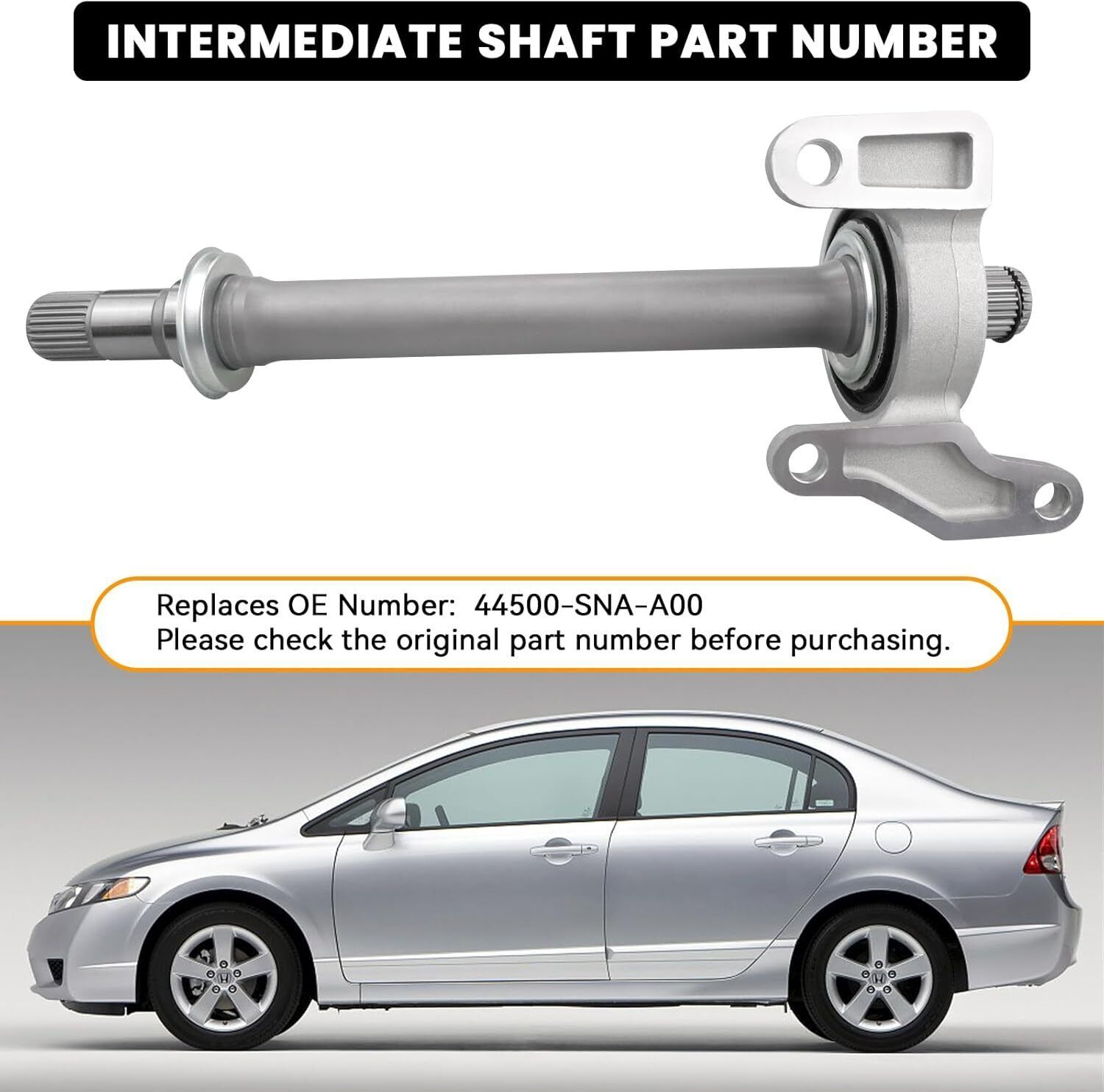 VEHICLES FITMENT-1: 44500-SNA-A00 Intermediate Shaft is compatible with HONDA CIVIC FA1 2006-2008, CIVIC FA1 2009-2011; More details please check the description information. Replaces OE Number: OEM References: 44500-SNA-A00, 44500 SNA A00, 44500SNAA00. Please always check OEM number listed for fitment confirmation. EASY INSTALLATION: Easy to install, no need for extra installation tools, saves time and money, and has a long service life. High Quality Material: Made of durable material which is corrosion, direct replacement to your original unit. Package Include: 1 x Intermediate Shaft MT