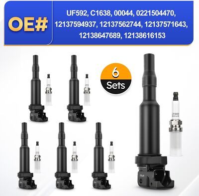 For 11-12 1 Series M 3.0L?08-13 128i 3.0L?08-10 135i 3.0L. For 03-05 325i 2.5L?07-13 328i 3.0L?09-13 328i xDrive 3.0L?2006 330i 3.0L?07-10 335i 3.0L?09-10 335i xDrive 3.0L?11-12 335is 3.0L?07-08 335xi 3.0L. For 08-11 528i 3.0L?2007 530i/530xi 3.0L?08-10 535i 3.0L?09-10 535i xDrive 3.0L?2008 535xi 3.0L?11-16 550i 4.4L?10-13 550i GT/GT xDrive 4.4L?11-16 550xi 4.4L. For 12-16 650i/650i xDrive 4.4L.For 12-16 M5/M6 4.4L. For 11-15 Alpina B7 4.4L. For 11-12 740i 3.0L?09-12 750i 4.4L?11-12 750i xDrive 4.4L?09-12 750Li 4.4L?10-12 750Li xDrive 4.4L?10-15 760Li 6.0L. For 11-12 X3 3.0L excluding Turbo Models?07-10 X3 3.0L. For 11-12 X5 4.4L?07-10 X5 3.0L excluding Diesel Engines?10-16 X5M 4.4L. For 08-16 X6 4.4L?08-10 X6 3.0L?10-11 X6 Hybrid 4.4L?10-16 X6M 4.4L. For 07-16 Z4 3.0L?09-13 Mini Cooper 1.6L excluding Turbo Models?08-13 Mini Cooper Clubman 1.6L excluding Turbo Models?11-13 Mini Cooper Countryman 1.6L excluding Turbo Model. ?Excellent Function: A faulty ignition coil spark plug may result in engine misfire, rough engine idle, decrease in power, poor fuel economy etc. Every component either matches or improves on the OE design to ensure fast and easy installation with superior performance and reliability. to provide superior cold-start performance and a smoother running engine. ?High-quality: The spark plug is double iridium spark plug, have a much longer working life, can work 100000 kilometers, consistent and stable spark. The ignition coil made of premium quality materials, stainless-steel spring with internal ferrite noise suppressor prevents radiofrequencyinterference, advanced thermoplastic coilconnector ensures proper connectionand resists fractures causedby heat and thermai cycling, to better transfer the high voltage created by the engine?s spark plug. ?OE# UF592+12120032137. Replace OE# C1638, 00044, 0221504470, 12137594937, 12137562744, 12137571643, 12138647689, 12138616153. Package included: Ignition Coil Packs x6, Double Iridium Spark Plug x6. Not included instruction manual, easy to install. ?After-Sales Service: We offer 24 hours customer service and 1 year product service, If you are encounter product installation, product quality and other problems, please feel free to contact us.