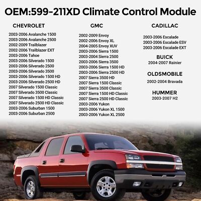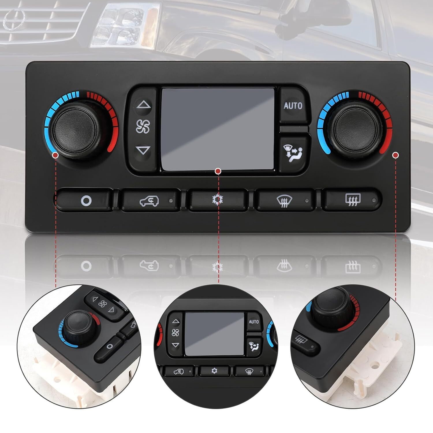 Fitment: This A/C Heater Climate Control Module Panel Switch Compatible with 2002-2009 Chevrolet Silverado Suburban Tahoe Trailblazer Avalanche, Compatible with 2002-2009 GMC Sierra Yukon Envoy, Compatible with 2003-2006 Cadillac Escalade, Compatible with 2003-2007 Hummer H2, Compatible with 2004-2007 Buick Rainier, Compatible with 2002-2004 Oldsmobile Bravada. Replace OE#: 10367041, 10367042, 10399657, 15077479, 15079112, 15085358, 15105215, 15105969, 15107730, 15132070, 15133519, 15136332, 15137655, 15165918, 15175897, 15185639, 15192450, 15195331, 15195380, 15195564, 15201969, 15202099, 15203179, 15214766, 15220310, 15220319, 15222482, 15763065, 15814152, 15832311, 15832314, 15832316, 15832318, 15845093, 15855848, 15855849, 21997426, 21997427, 21998695, 21999159, 21999163. Feature: The A/C Climate Control Module Panel Switch Allows the Driver to Control the A/C Heating, Ventilation, Air Conditioning System by Adjusting the Control Knob Switches for the Desired Airflow, Speed and Temperature of the Air Inside the Vehicle. a Variety of Wind Adjustment Functions to Meet Various Needs, the Internal Circulation Function Can Reduce the External Pollutants Entering the Car and Improve the Efficiency of the Air Conditioning. Easy To Installthis: Climate Control Module Can be Installed Directly. Each Interface and Buckle can Perfectly Fit with the Original Car, Ensuring Stable Installation. What You Will Get: 1x Climate Control Module Panel. Each Item is Thoroughly and Rigorously Tested. If You Have any Problems During Use, Please Feel Free to Contact us, We will Give You a Satisfactory Customer Service.