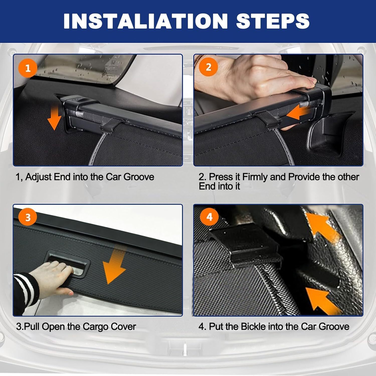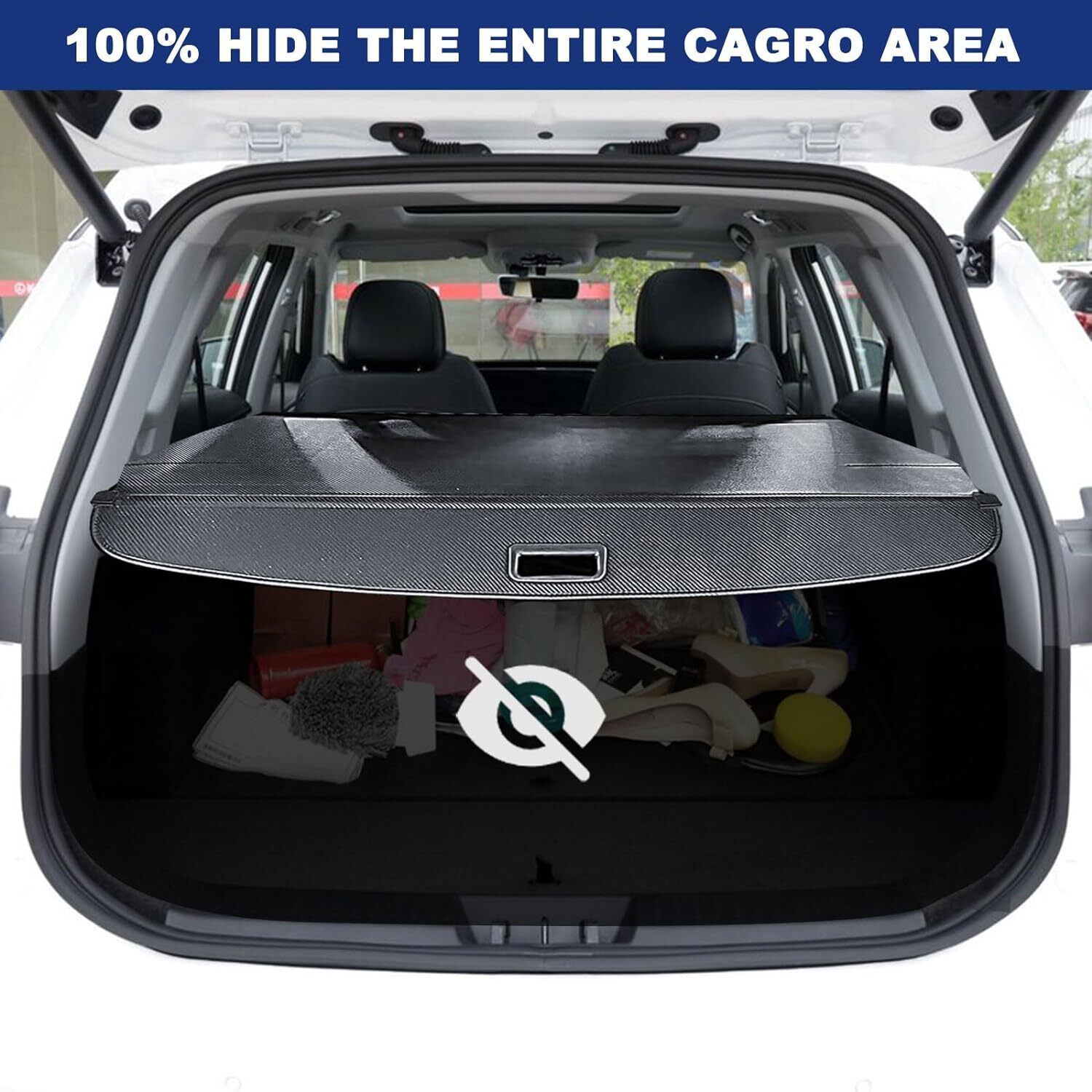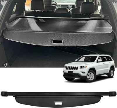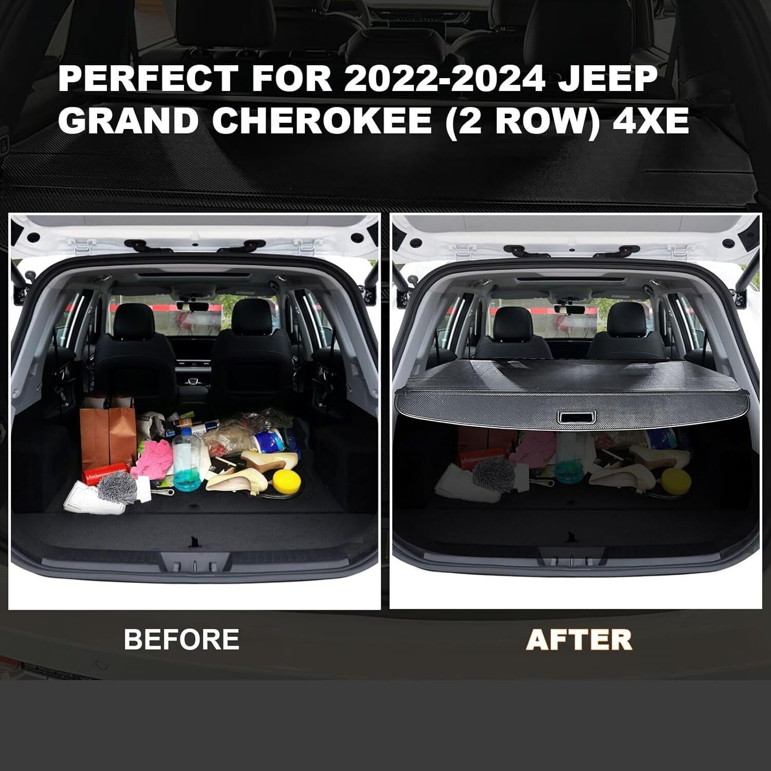 ?Perfect For?Jeep Grand Cherokee cargo cover retractable cargo cover perfect fit for Jeep Grand Cherokee all model 2022 2023 2024 (Two Row; WL) 4XE, Designed according to the original vehicle radian and Fits perfectly in the car's grooves ?Carbon Fiber Black Texture?Jeep Grand Cherokee trunk cover with carbon fiber exterior to add fashionable and beauty to your car ?100% Privcy?Jeep Grand Cherokee cargo cover protect your cargo from being seen by others.Not worrying anyone will see in through the panoramic roof or the windows ?Material?Jeep Grand Cherokee cargo cover made of high strength canvas, UV resistant, high fiber strength, not easy to tear or scratch. Carbon fiber pattern appearance, cross brace is made of high strength, lightweight aluminum alloy. ?Easy to Install? No tools required. Simply insert the crossbar into the groove before pulling out the cargo cover. when the shade is extended it covers the cargo area completely (assuming the rear seats are fully reclined, as expected)