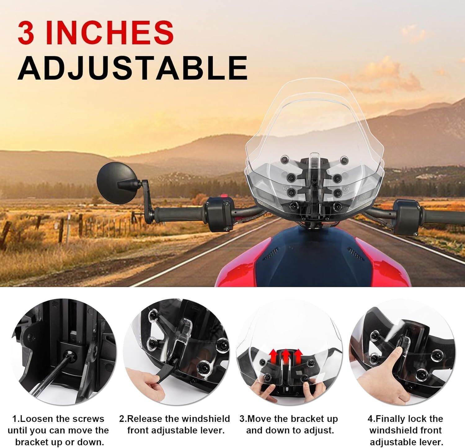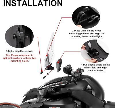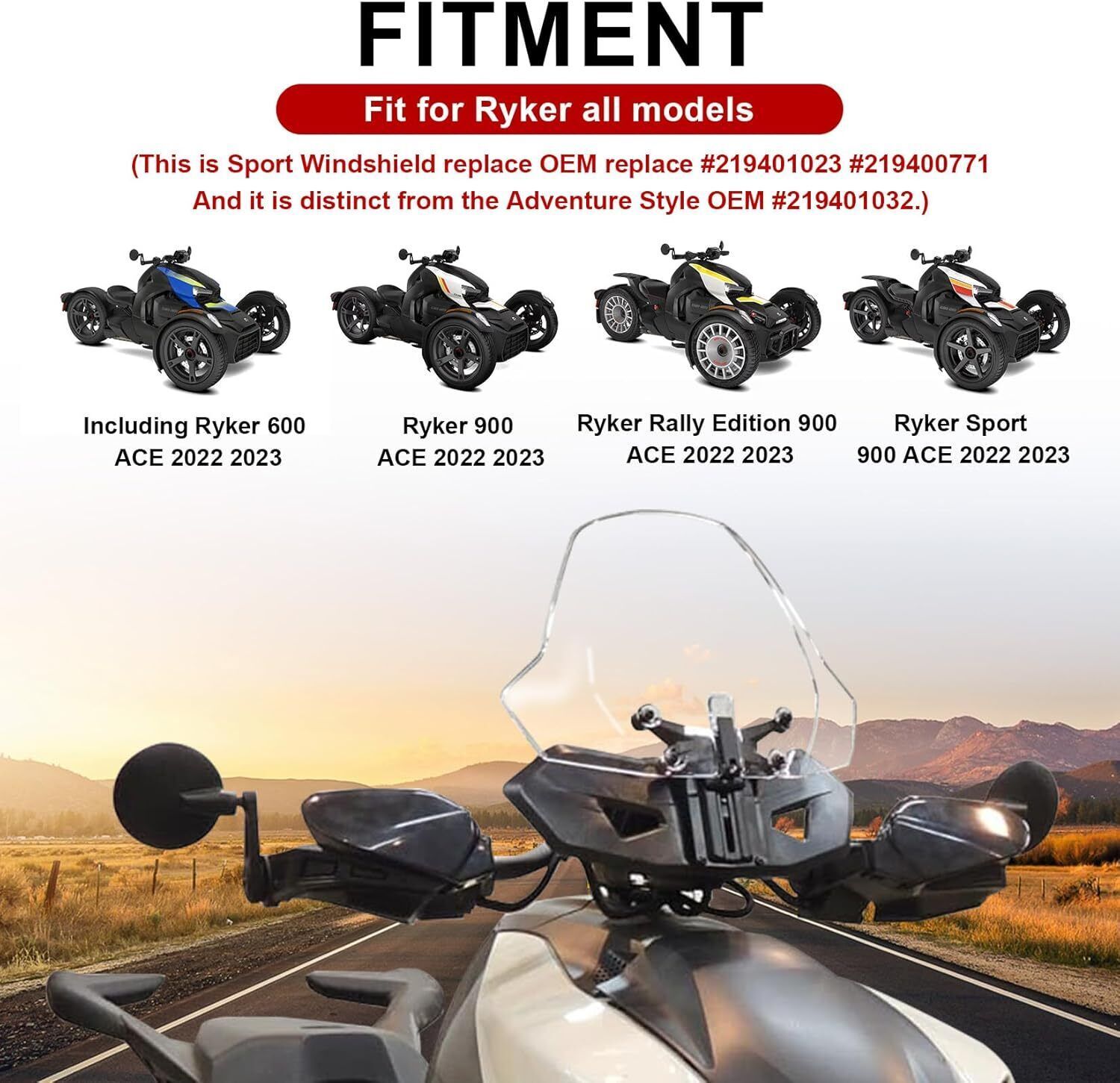 ?Fitment?Front Windscreen fit for Ryker all models.Such as Ryker 600 Ryker 900 Ryker Rally Ryker Sport.Including Ryker 600 ACE 2022/2023,Ryker 900 ACE 2022/2023,Ryker Rally Edition 900 ACE 2022/2023,Ryker Sport 900 ACE 2022/2023.This is Sport Windshield replace OEM replace #219401023 #219400771.And it is distinct from the Adventure Style OEM #219401032. ?Good Material?Ryker Wind Deflector is made of optical-grade polycarbonate material,lightweight but with superior abrasion and heat resistance.Offer the best visibility.Easily coping with all kinds of weather extremes,giving you a long service life.Good material offers high strength,superior impact resistance and scratch resistance,not easy to break,much better than ordinary plastics.And comes with a matching aluminum brackets,anti-corrosion and rust-resisting. ?3 inches of adjustment?The design of slide bar provide an extra 3 inches of adjustment space.Adjust the Ryker Windscreen up and down to find the perfect angle height and airflow that works best for you for maximum comfort.Suitable for people of different heights.Provide a larger area of protection for the upper body.Frameless design gives you the best view and improves your riding safety. ?Application?These screens raise the wind-blast several centimeters allowing a more comfortable position.Aerodynamic design allowing a comfortable ride at higher speeds.Excellent wind deflection and improved protection against wind. ?Package?1 Set of Ryker Wind Shield