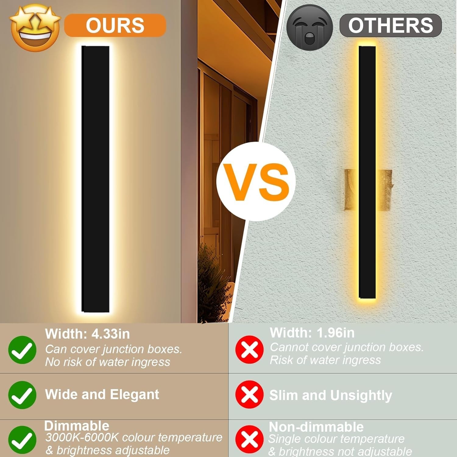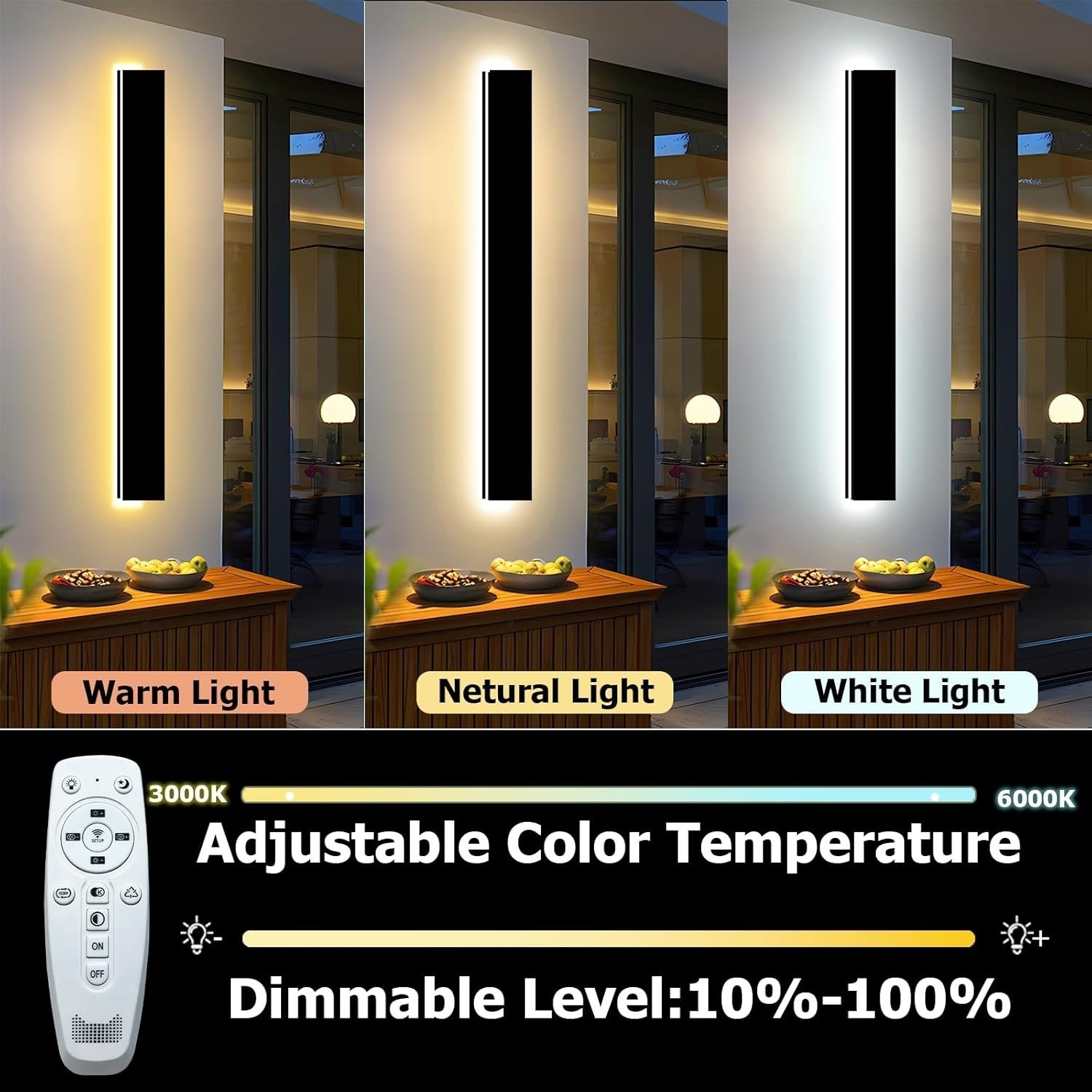 ?ADJUSTABLE COLOR TEMPERATURE AND BRIGHTNESS?: Enmln long outdoor modern led wall light can be adjusted by remote control to adjust the brightness and color temperature you want. The range of color temperature is 3000K-6000K, and the range of brightness is 10%-100%, you can adjust it according to the effect you want.