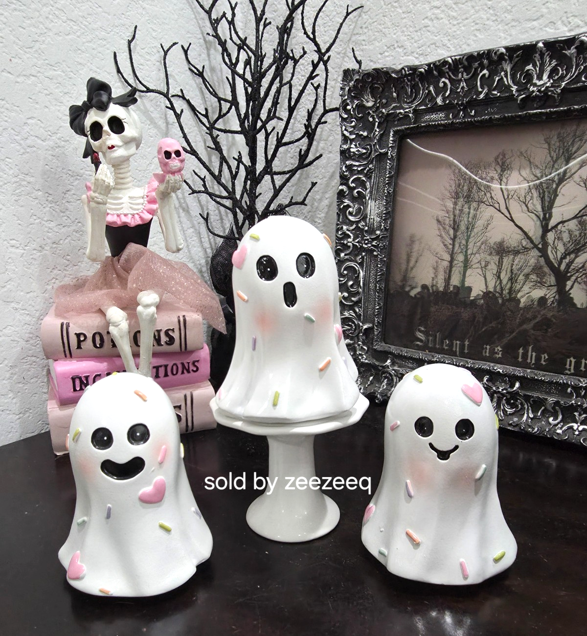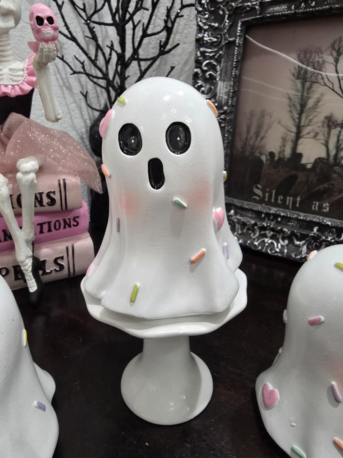 Up for sale are these 3 adorable mini ghost for your tabletop decor or perfect for a tier tray. The The ghost are sooo cute! They have pastel colored sprinkles on themn. Made of resin and measure approx 4" tall. New