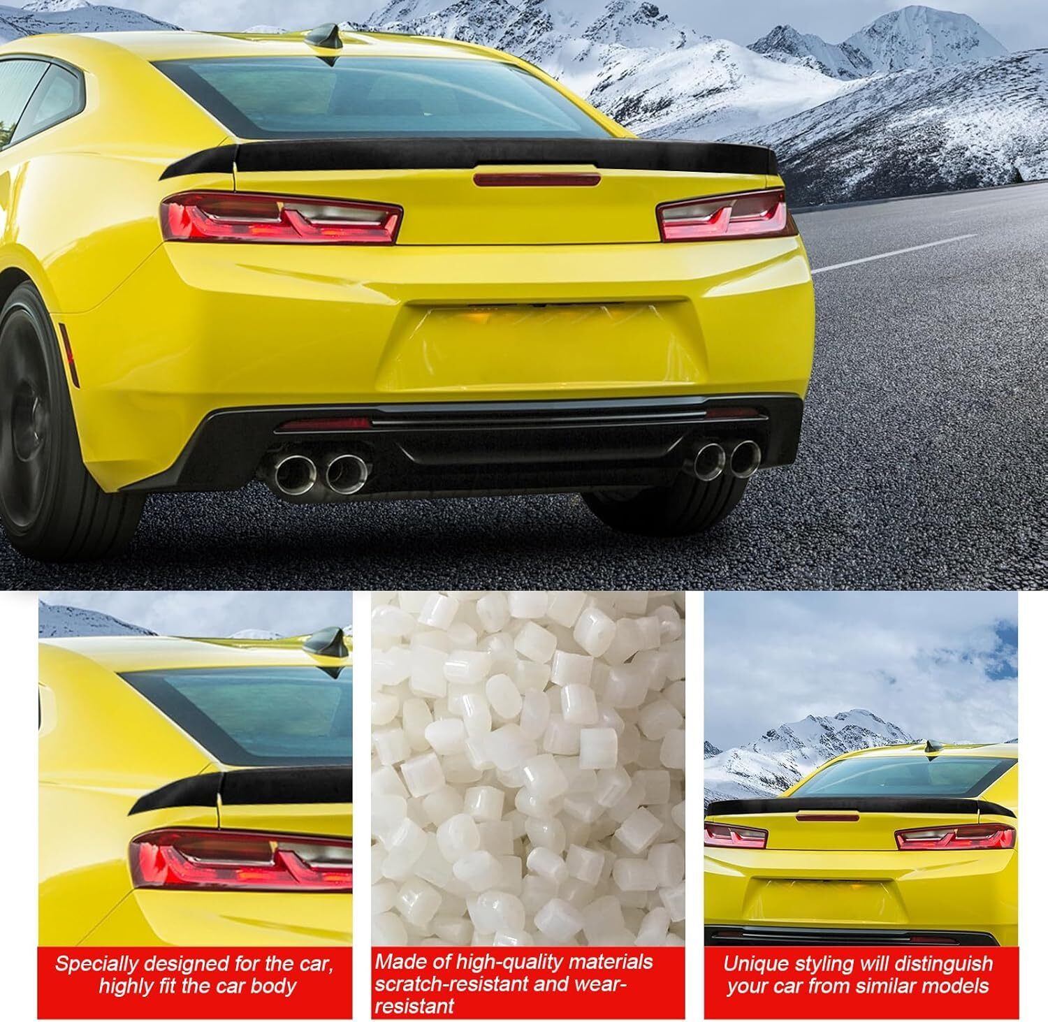 [ VEHICLE APPLICATION ] - This Rear Trunk Spoiler Wing fits for 2016-2020 for Chevrolet Camaro [ RELIABLE MATERIAL ] - Spoiler is made of high-quality strong ABS with reinforced structure, reliable and durable traction at high speed, ensuring safer drive and less gas consumption [ SPORTY AND STYLISH LOOK ] - The sporty rear spoiler is the perfect choice to make your car noticeable and its owner unique [ AERODYNAMIC CHARACTERISTICS ] - With this spoiler, up-lift at the tail of your vehicle can be efficiently reduced. It adds traction at high speed, ensuring safer drive and less gas consumption [ IMPORTANT NOTES ] - Please check Compatibility and Product Size for reference. If you have any questions about our products or our services, please feel free to contact us