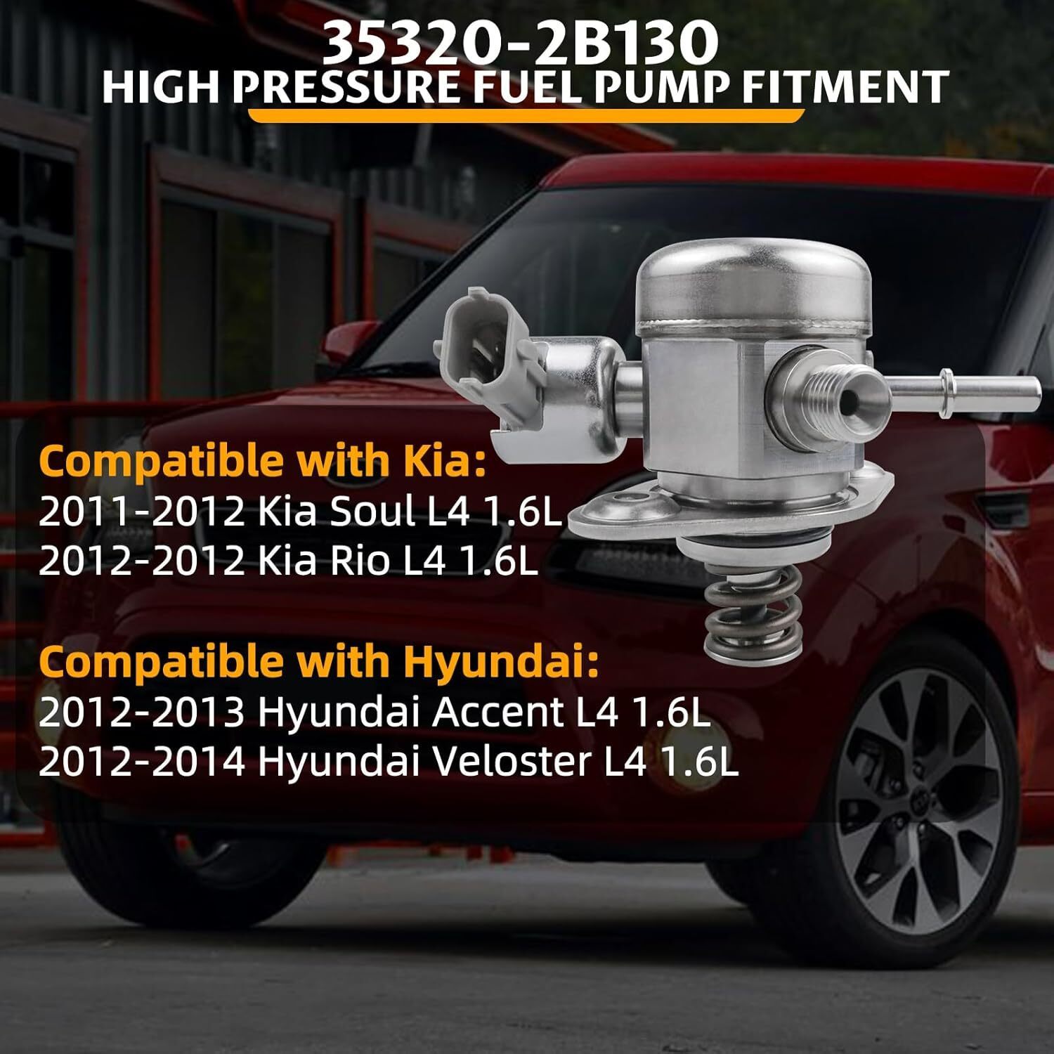 Part Number: 35320-2B130, 353202B130, 35320-2B100, 353202B100. Please check the part number of original fuel pump before ordering. Vehicle Fitment-1: 35320-2B130 High Pressure Fuel Pump Compatible with Hyundai Accent 2012-2013 L4 1.6L, Veloster 2012-2014 L4 1.6L. Vehicle Fitment-2: 35320-2B130 High Pressure Fuel Pump Compatible with Kia Rio 2012 L4 1.6L, Soul 2011-2012 L4 1.6L. Precision Design: Using precise manufacturing technology to ensure perfect compatibility with the vehicle's fuel system, it can operate under high pressure, ensuring that your engine achieves the precise fuel required for peak performance. CUSTOMER SUPPORT: We provide one-year warranty and 24 Hours technical support, If you have any problems, please feel free to contact us and we will reply to you within 24 hours.