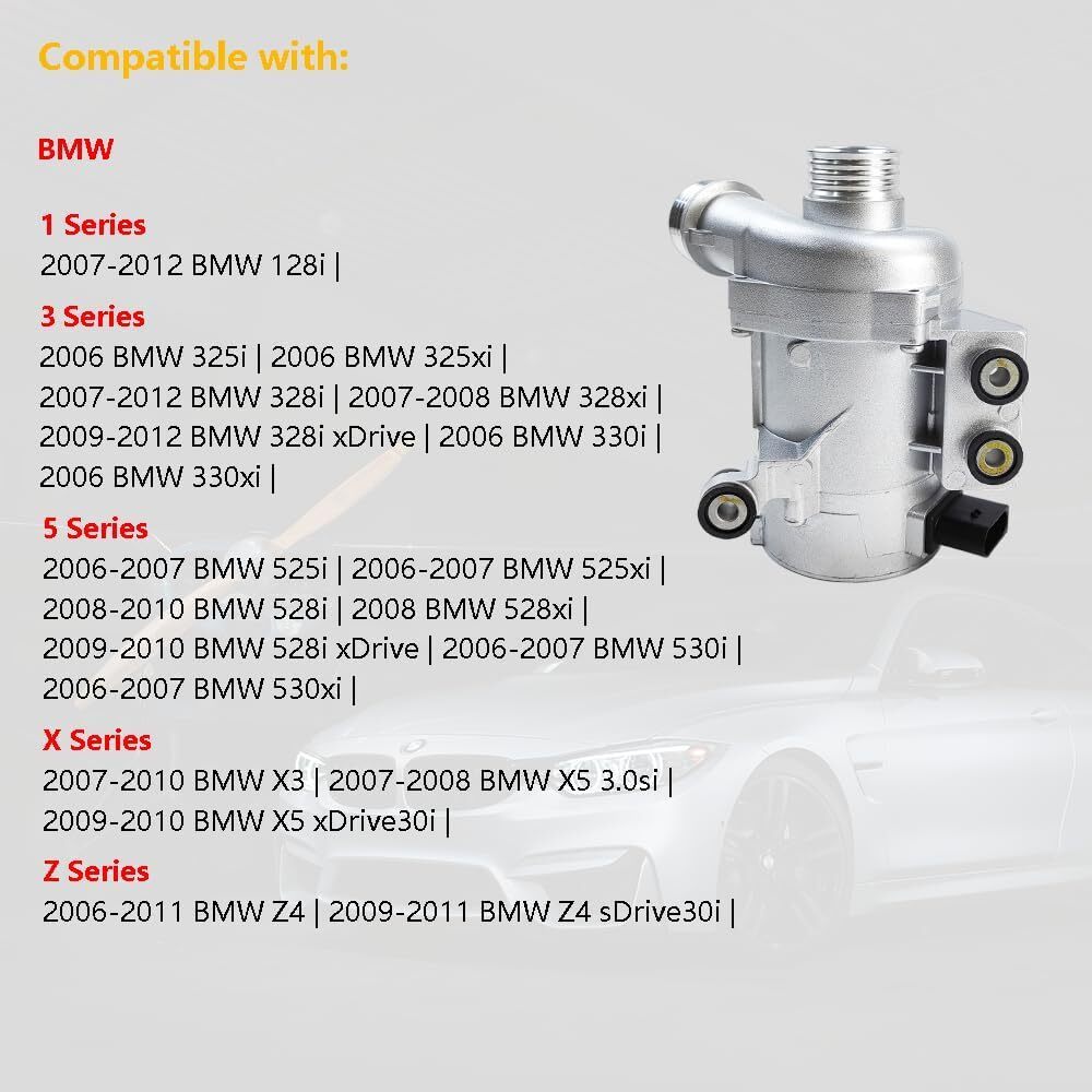 OE Number: 11517586925 | 11517586924 | 11517563183 | 11517546994 | 11517545201 | 11517521584 | 11510392553 | 702851208 | 59660 | Compatible with: 2007-2012 BMW 128i | | 2006 BMW 325i | 2006 BMW 325xi | 2007-2012 BMW 328i | 2007-2008 BMW 328xi | 2009-2012 BMW 328i xDrive | 2006 BMW 330i | 2006 BMW 330xi | | 2006-2007 BMW 525i | 2006-2007 BMW 525xi | 2008-2010 BMW 528i | 2008 BMW 528xi | 2009-2010 BMW 528i xDrive | 2006-2007 BMW 530i | 2006-2007 BMW 530xi | | 2007-2010 BMW X3 | 2007-2008 BMW X5 3.0si | 2009-2010 BMW X5 xDrive30i | | 2006-2011 BMW Z4 | 2009-2011 BMW Z4 sDrive30i | Package includes: 1 x Electric Water Pump | 1 x Plug with Wire | 3 x Installation Bolts | Direct replacement, includes necessary bolts plug needed for easier installation.