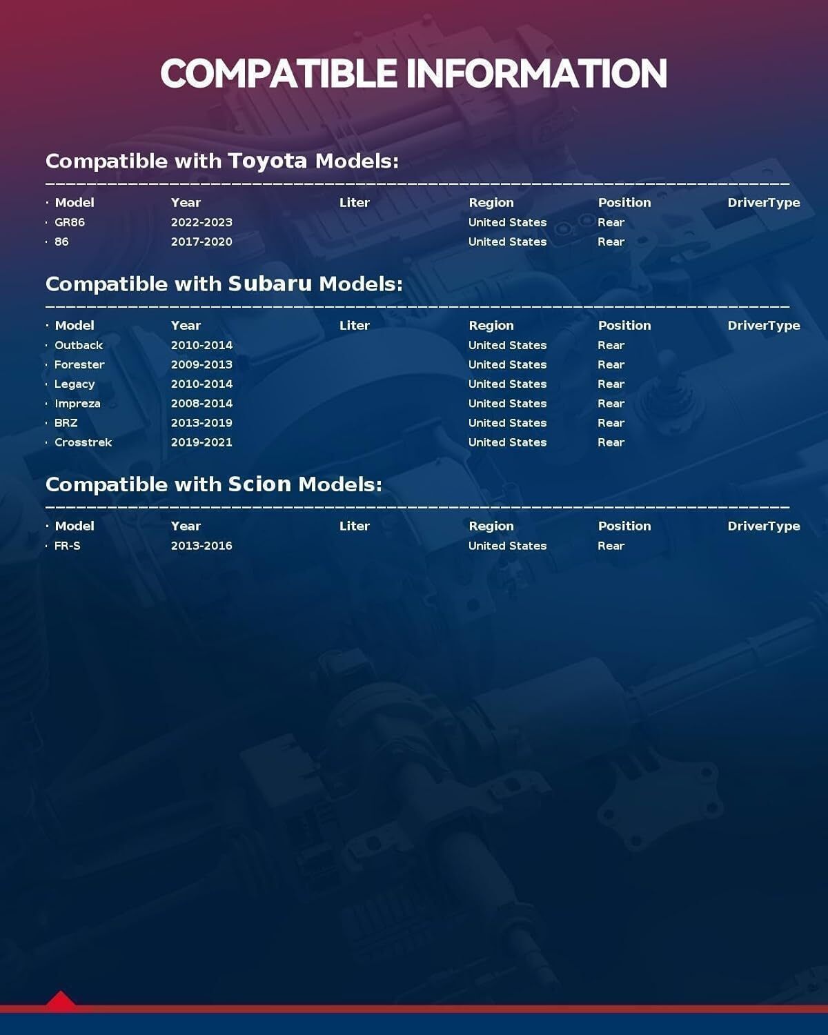 Compatibility - 512401 Pair Wheel Hub Bearing Assembly fit for 2010-2014 Subaru Outback, 2009-2013 Subaru Forester, 2010-2014 Subaru Legacy, 2008-2014 Subaru Impreza, 2013-2016 Scion FR-S, 2013-2019 Subaru B-R-Z, 2022-2023 Toyota GR86, 2017-2020 Toyota 86, 2019-2021 Subaru Crosstrek Upgraded Performance - Wheel bearing assemblies are manufactured with premium #55 carbon structural steel for high hardness and strength. Our hub bearings have undergone vehicle testing to ensure proper fitment and excellent performance, providing users with longer service life. Function - Wheel hub bearing enables the wheels and attached components to rotate smoothly and keeps the wheel attached to the car. KAX hub bearings can provide you with a smooth and quiet driving environment, enhancing your driving experience. Installation - Wheel hubs excellent assembly performance, precise overall structure, easy and quick installation. Customer Service - KAX Wheel hub assembly meet OE quality standards and come with a 3-year warranty. If you have any questions about our products, please contact us 24 hours a day.