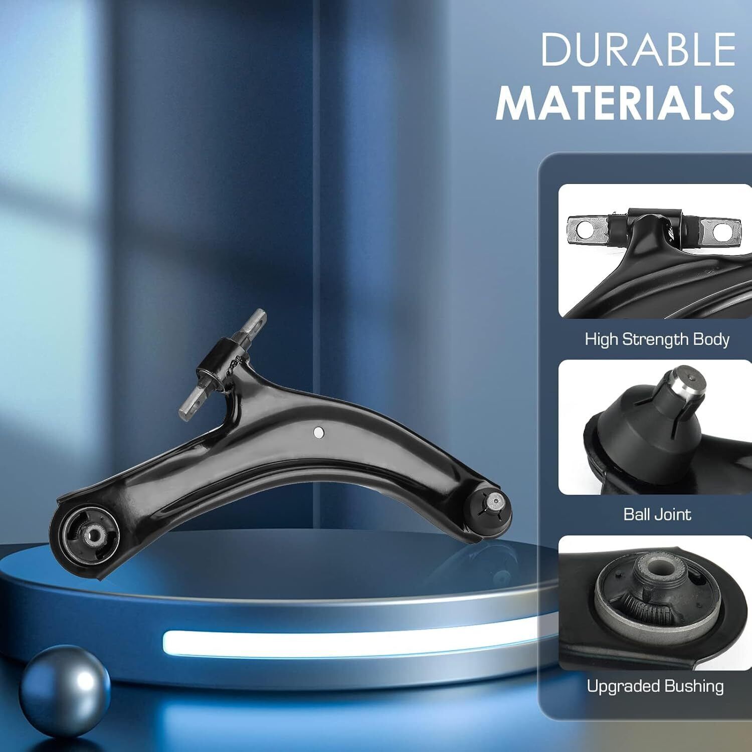 ?Compatibility?Fits for Nissan Rogue Engine 2.5L 2008 2009 2010 2011 2012 2013, Rogue Select Engine 2.5L 2014 2015 ?Kit Includes?2 x Front Lower Control Arms with Ball Joints ?Enhanced Structural Strength? High-strength structure can withstand repeated impact loads, making it more stable during operation ?Premium Ball Joints?For noise-free, articulation and durability, we sourced premium ball joints for our tubular upper control arms. Compared to other common ball joint brands, our ball joint exhibits one of the highest articulation angle. ?Safety?Control arm with strong torsional resistance, good stability, better response to wear and fatigue, and long service life.