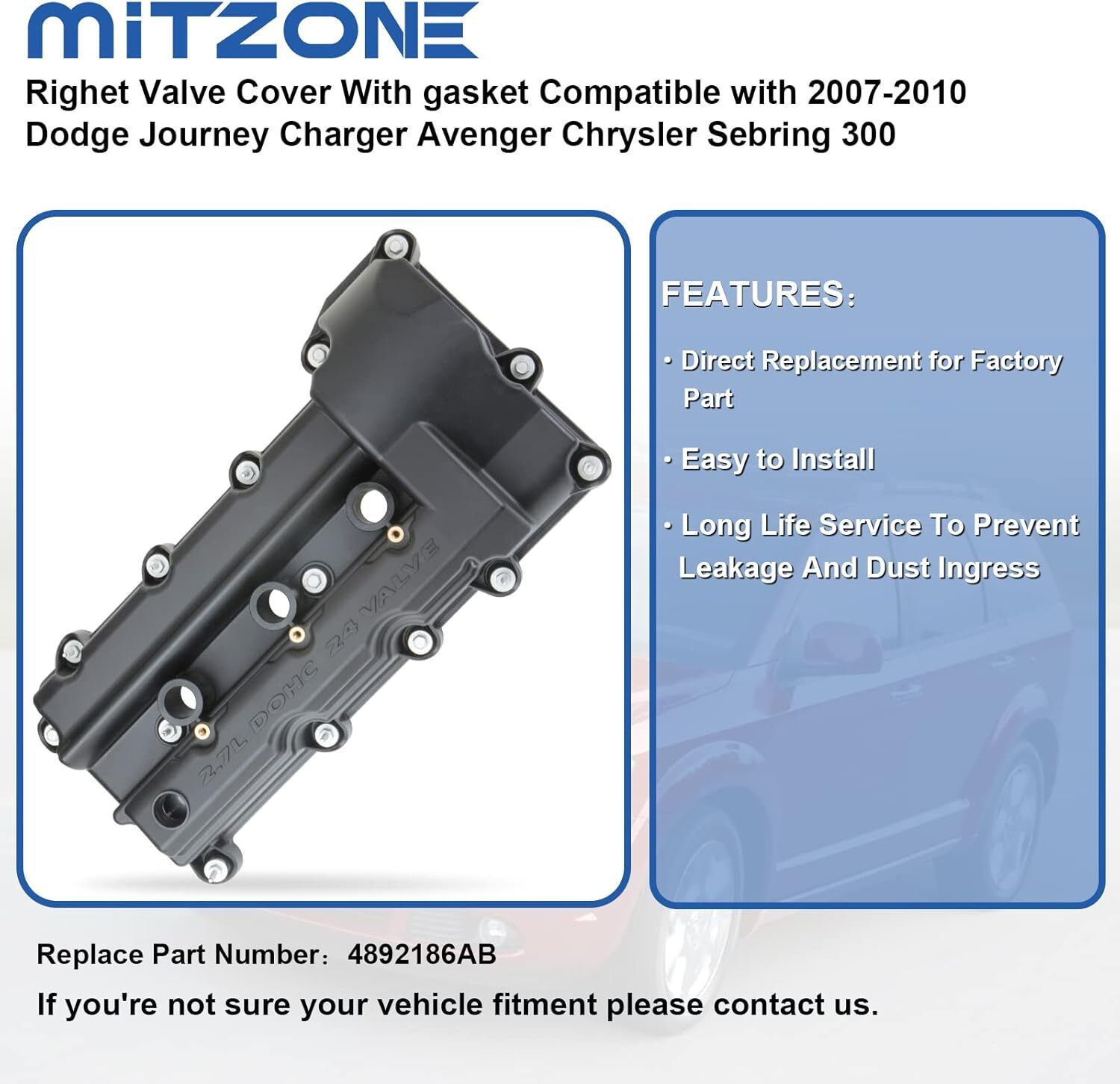 Righet Valve Cover fit 2006-2008 Magnum ,2009-2010 Journey , 2006-2010 Charger , 2007-2010 Avenger , 2006 Stratus , 2006-2010 Chrysler Sebring , 2006-2010 Chrysler 300 Replacement for Part Numbers: 4892186AB Complete Valve Cover with Bolts , Valve Cover Gaskets , Spark Plug Seals Durable construction - this valve cover is made of quality materials to withstand extreme temperatures to resist leaking PURCHASE WITH CONFIDENCE: If you are not sure about the vehicle fitment or any questions or concerns, please message us via amazon. We will resolve the issue to meet your satisfaction