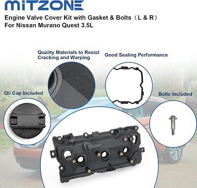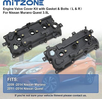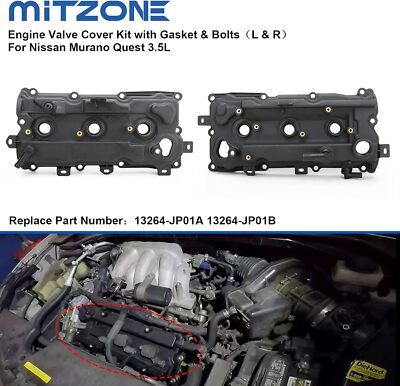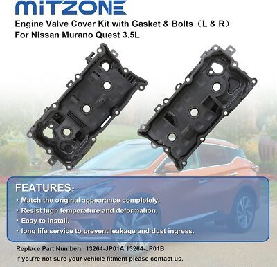EXCAT MATCH : MITZONE engine valve cover set is compatible with 2009-2014 Nissan Murano Quest 3.5L . The installation positions are respectively in front and below engine intake manifold. Please be careful to check our product information, make sure what the photo showed is as same as you purchase OE PART NUMBER : Replaces 13264-JP01A 13264-JP01B , This valve cover kit has been tested by strict quality standards, meet or exceed OE standard quality and performance requirements to fit your vehicles VALUABLE CHOICE : Advanced PA66 plastic resist high temperature corrosion and deformation . Good sealing performance which effectively prevent the wear of parts caused by oil leakage and dust ingress . High quality guarantees exceptional service life Complete Valve Cover Sets with Bolts Oil Cap Valve Cover Gaskets Spark Plug Seals PCV Valve. Easy and ready for installation PURCHASE WITH CONFIDENCE: If you are not sure about the vehicle fitment or any questions or concerns, please message us via amazon. We will resolve the issue to meet your satisfaction