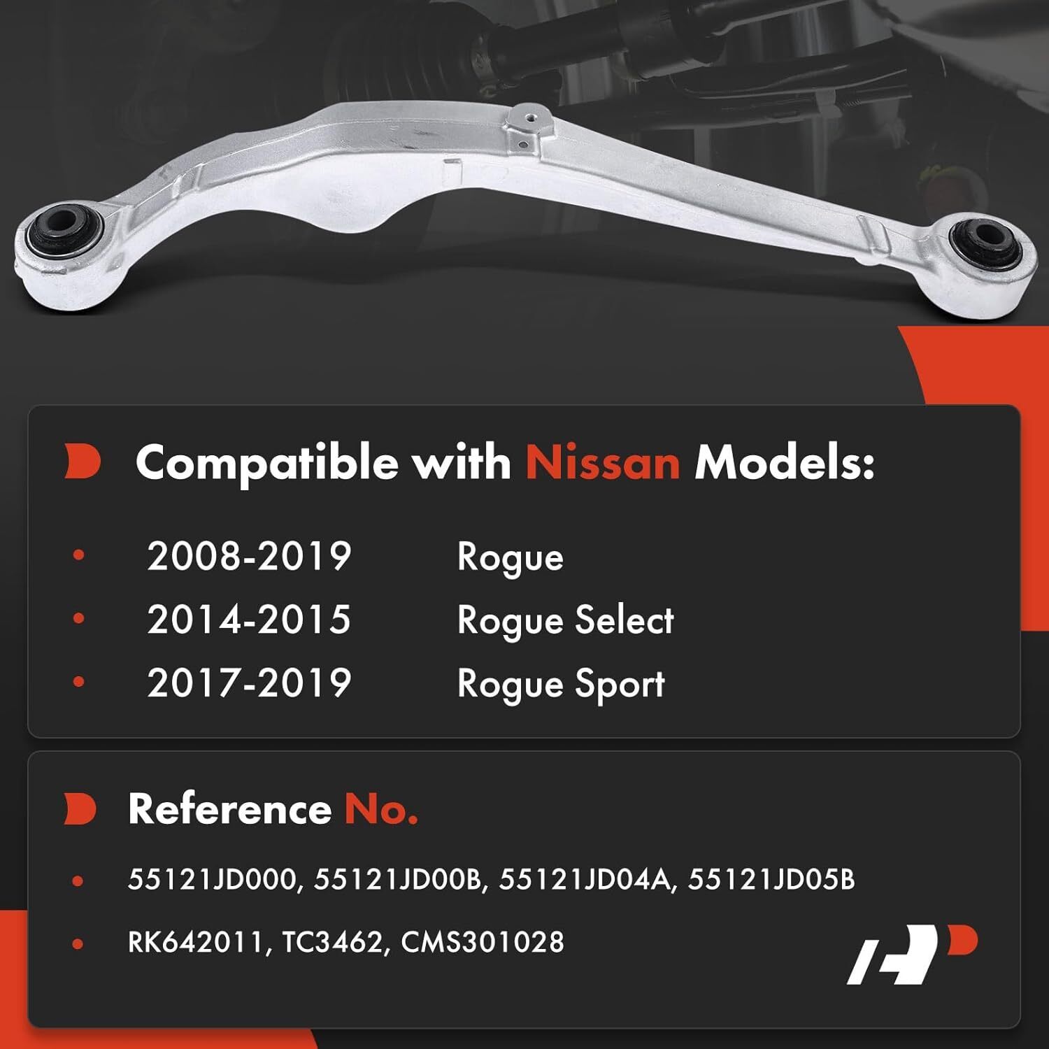 [Vehicle Fitment]: Compatible with Nissan Rogue 2008-2019 ? Rogue Select 2014-2015 ? Rogue Sport 2017-2019 ? [Installation Position]: Rear Upper Left Driver Side [Professional Replacement]: This control arm assembly is replacement for above model's suspension system, and may help you resolve those problems: ? clunking noise ? steering wander ? uneven tire wear ? excessive vibration !!!! [Specification]: Condition: Brand New; Material: Aluminum; Control Arm Bushing Included: Yes; Ball Joint Included: Yes; Pre-Greased: Yes; Accessories Included: As Picture; About Warranty: 1-Year [Reference Part Number]: 55121JD000, 55121JD00B, 55121JD04A, 55121JD05B, RK642011, TC3462, CMS301028