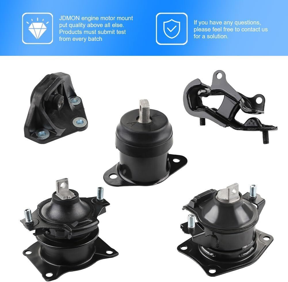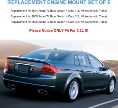 Fitment: JDMON Engine motor mounts replacement for 2004 2005 2006 Acura TL 3.2L V6. Please notice only fit for 3.2L and check the fitment carefully before purchasing. Benefits of Replacing Broken Engine Mounts: Reduce the engine noise and shock. Protect the engine and prolong its service life. Improve your driving comfort, smoothness and driving safety. Replacement for Part Number: A4526, A4527, A4517, A4544, A4524. Package Includes: 1* Front Mount, 1* Rear Mount, 1* Front Right Mount, 1* Left Transmission Mount, 1* Transmission Mount High Strength and Durable: Our engine mounts are made from iron, aluminum and rubber, which has good durability and can withstand long-term use and various complex working conditions, reducing the frequency of maintenance and replacement. Recommendation and Services: The installation of auto parts is a very professional work, we strongly recommend that you install it under the guidance of professionals. If you have any questions, please feel free to contact us.
