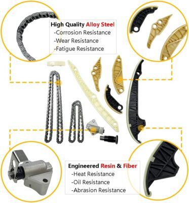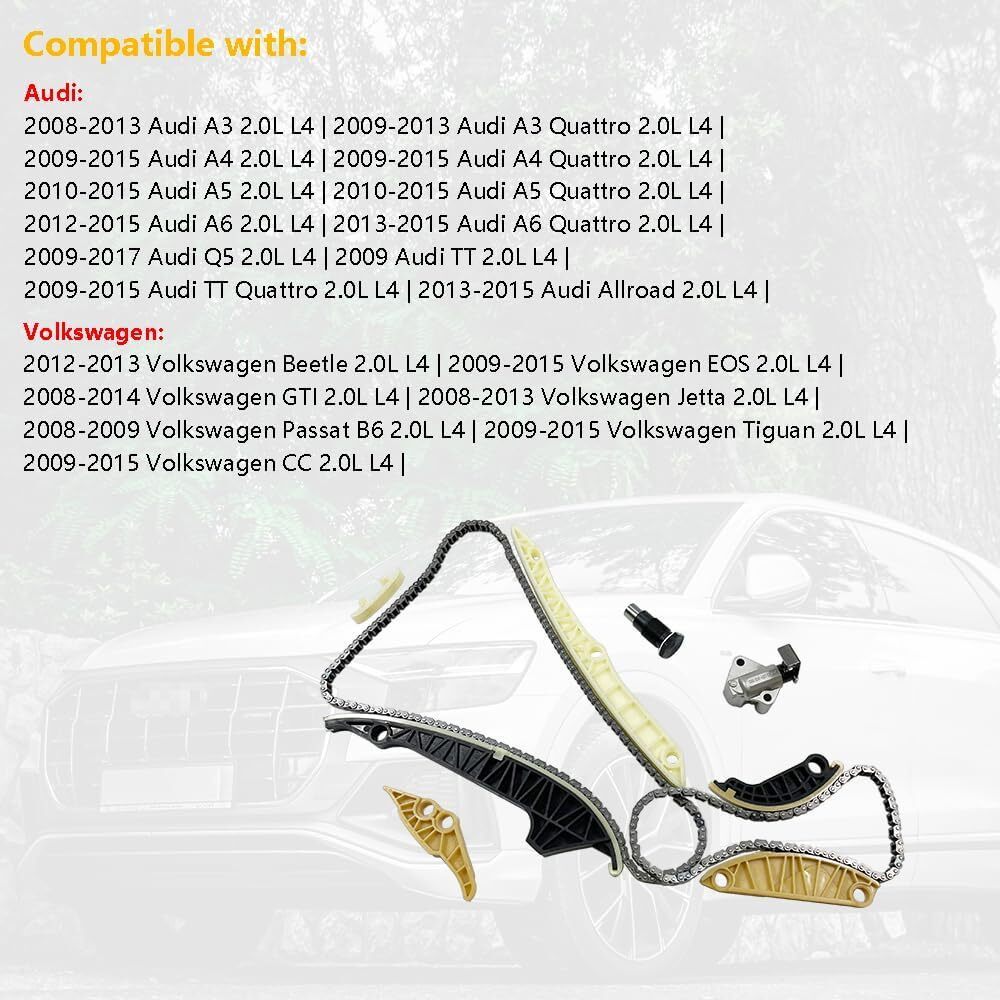OEM number: ?06H109469AD | 100672 | 06H109158N | 06H109467AF | 06H109467N | 06H109467R | 06H109469AN | 06H109469AP | 06H109469T | 06H109507M | 06H109509P | 06H109509Q | 06K109158A | 06K109158AD | 06K109467 | 06K109467K | Package includes: 1 Primary Timing Chain (170 Links) | 1 Secondary Timing Chain (96 Links) | 1 Tensioner (Primary) | 1 Tensioner (Secondary) | 1 Primary Chain Guide (Upper) | 1 Primary Chain Guide (Lower-Left) | 1 Primary Chain Guide (Lower-Right) | 1 Secondary Chain Guide (Lower-Left) | 1 Secondary Chain Guide (Lower-Right) | 1 Secondary Chain Guide (Upper) | Compatible with Audi: 2008-2013 Audi A3 2.0L L4 | 2009-2013 Audi A3 Quattro 2.0L L4 | 2009-2015 Audi A4 2.0L L4 | 2009-2015 Audi A4 Quattro 2.0L L4 | 2010-2015 Audi A5 2.0L L4 | 2010-2015 Audi A5 Quattro 2.0L L4 | 2012-2015 Audi A6 2.0L L4 | 2013-2015 Audi A6 Quattro 2.0L L4 | 2009-2017 Audi Q5 2.0L L4 | 2009 Audi TT 2.0L L4 | 2009-2015 Audi TT Quattro 2.0L L4 | 2013-2015 Audi Allroad 2.0L L4 | Compatible with Volkswagen VW: 2012-2013 Volkswagen Beetle 2.0L L4 | 2009-2015 Volkswagen EOS 2.0L L4 | 2008-2014 Volkswagen GTI 2.0L L4 | 2008-2013 Volkswagen Jetta 2.0L L4 | 2008-2009 Volkswagen Passat B6 2.0L L4 | 2009-2015 Volkswagen Tiguan 2.0L L4 | 2009-2015 Volkswagen CC 2.0L L4 |