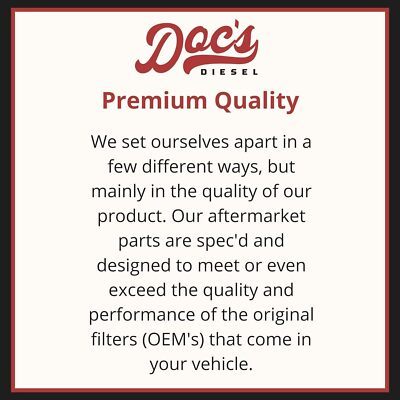 DIESEL FUEL FILTER ? Doc's Diesel Filters are spec'd and designed to meet or exceed the quality/performance of the original filters (OEM's) that come in your vehicle. Doc's premium grade media filter paper used on all Doc's Filters is what sets Doc's above the rest. DURABLE OEM FORM, FIT, AND FUNCTION ? Doc's Fuel Filters use a premium 3 layer media that meets or exceeds OEM requirements. INTERCHANGE ? Replaces FD4615 BC3Z9N184B. Always check fitment before using. FITMENT - Compatible with 2011-2016 6.7L Powerstroke. Designed and tested to meet and exceed OE Fuel filter requirements. DOC?S DIESEL FILTER - Doc's Diesel is the new standard in aftermarket diesel filters. Our Premium Diesel Filter line includes fuel, air, cabin air, water separator, and oil filters. Located in Northwest Ohio we are a grassroots company with a focus on high quality filters and providing a great value to our customers!